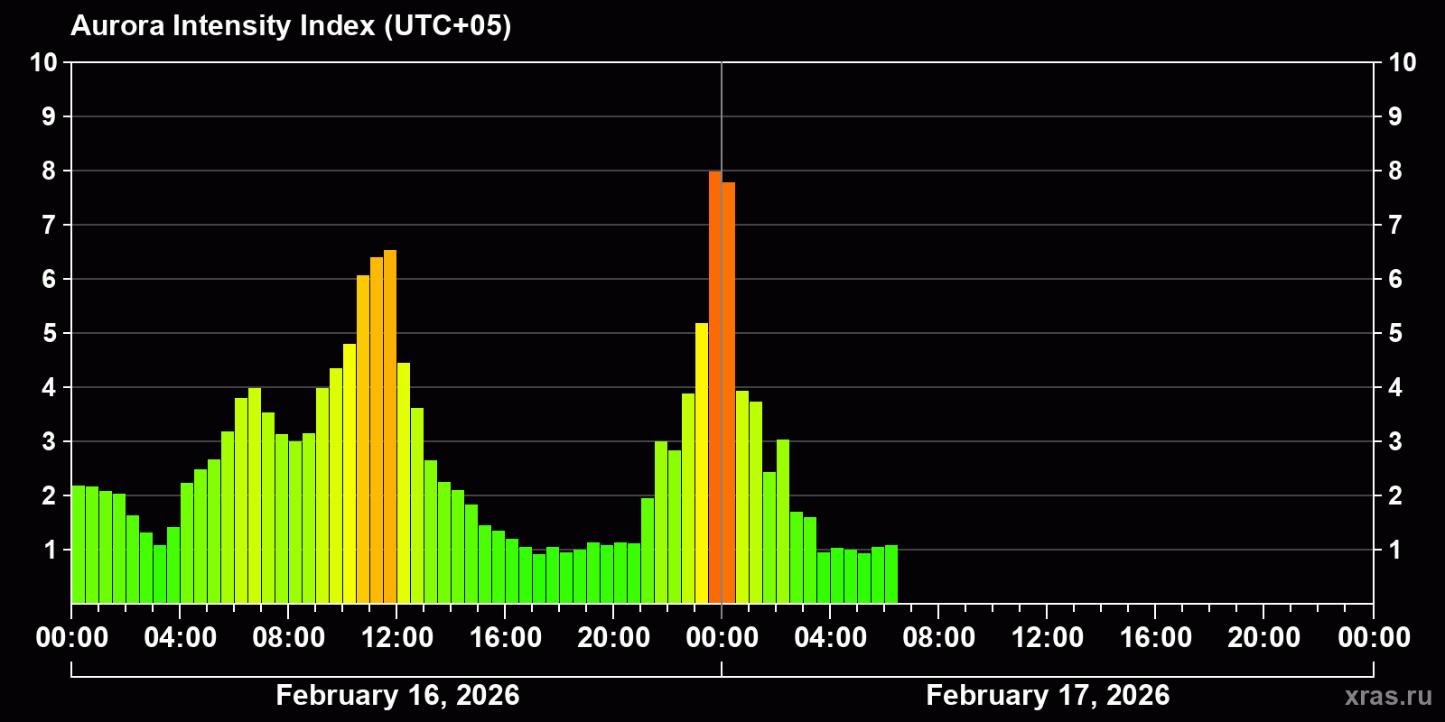 Auroral intensity index and the theoretically possible latitude of observations for nighttime in the Estern Hemisphere as of 2026-02-17 04:37 (end of day) local time