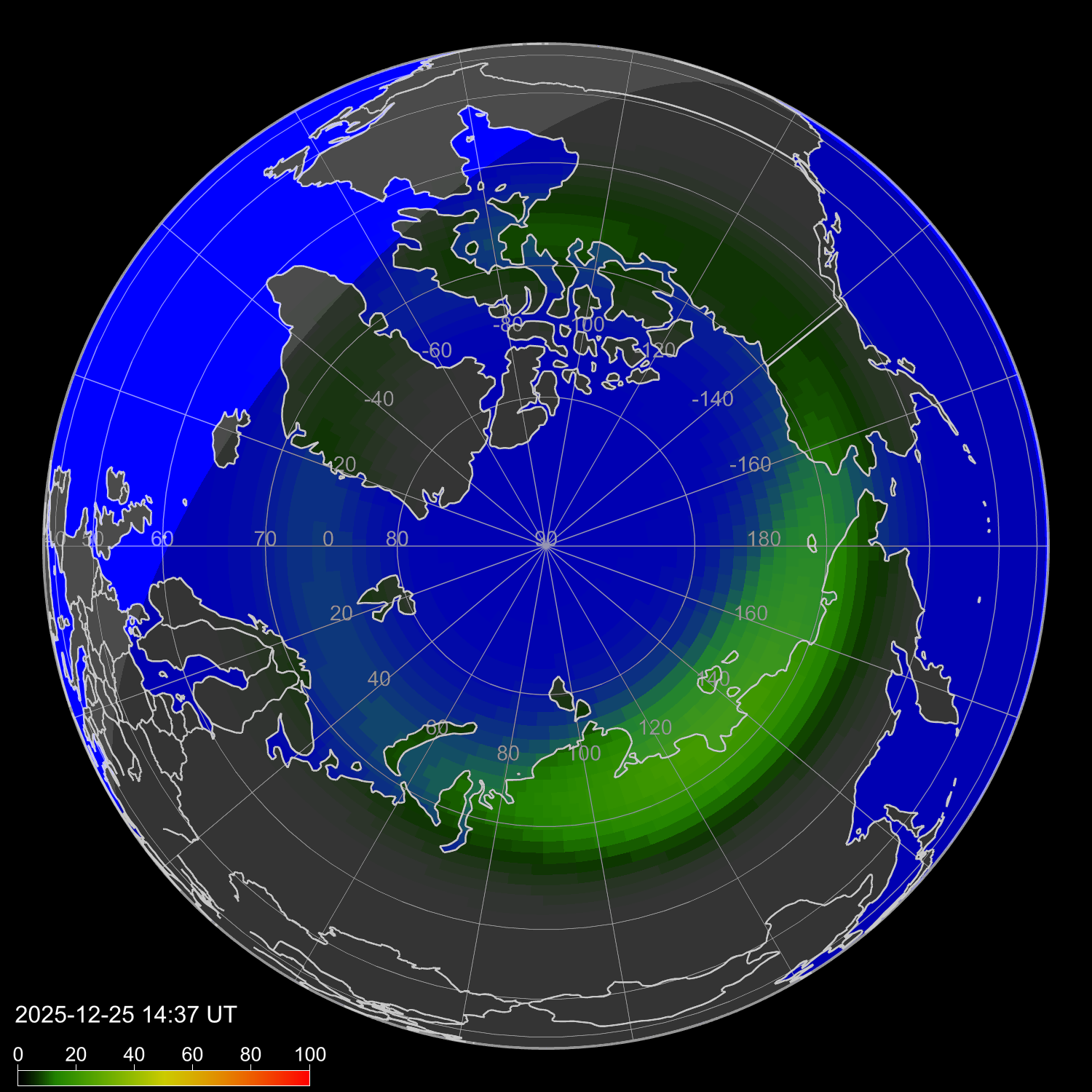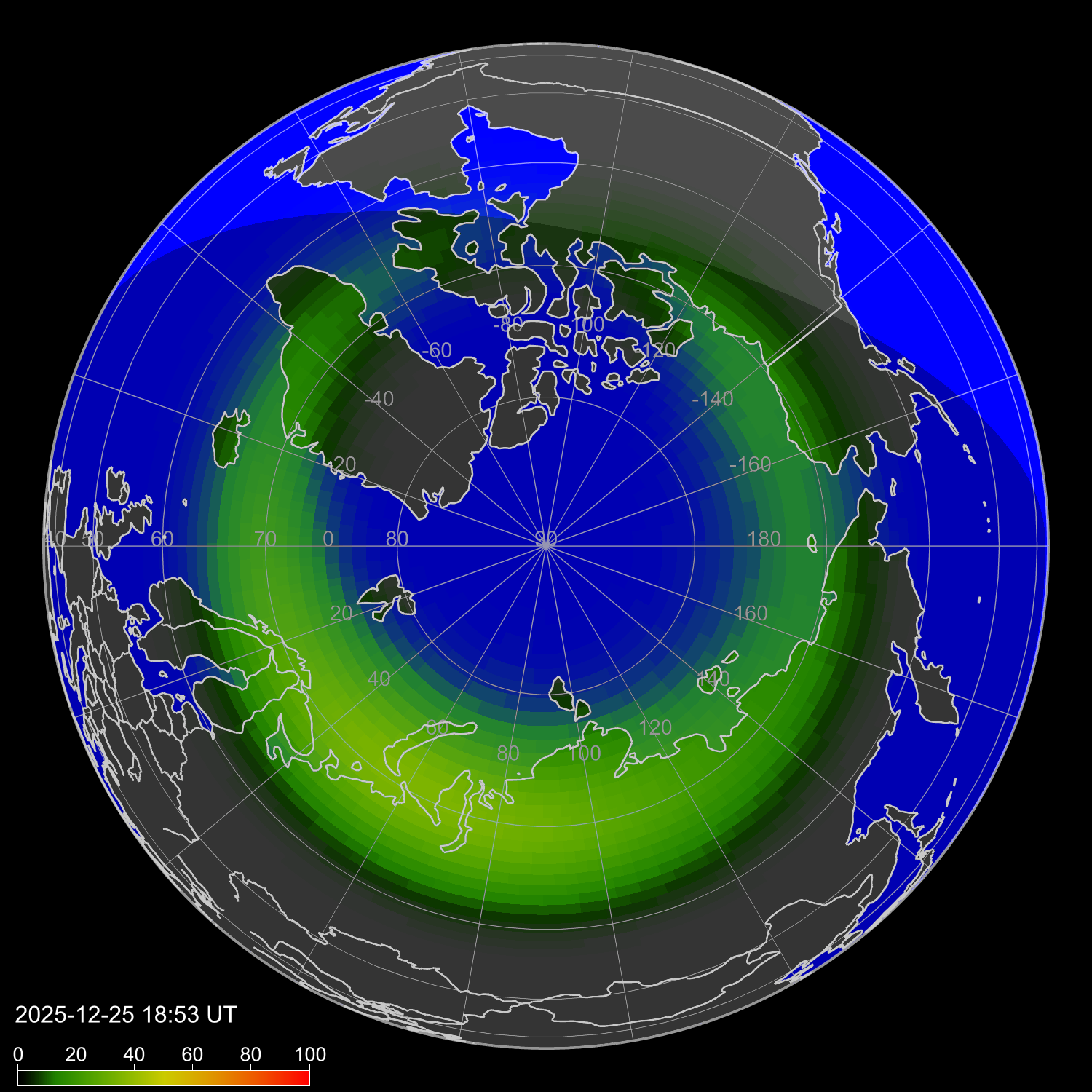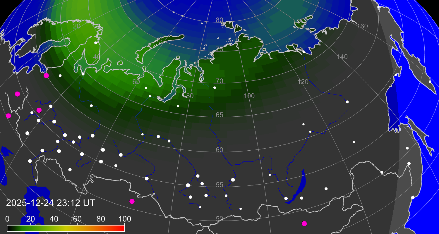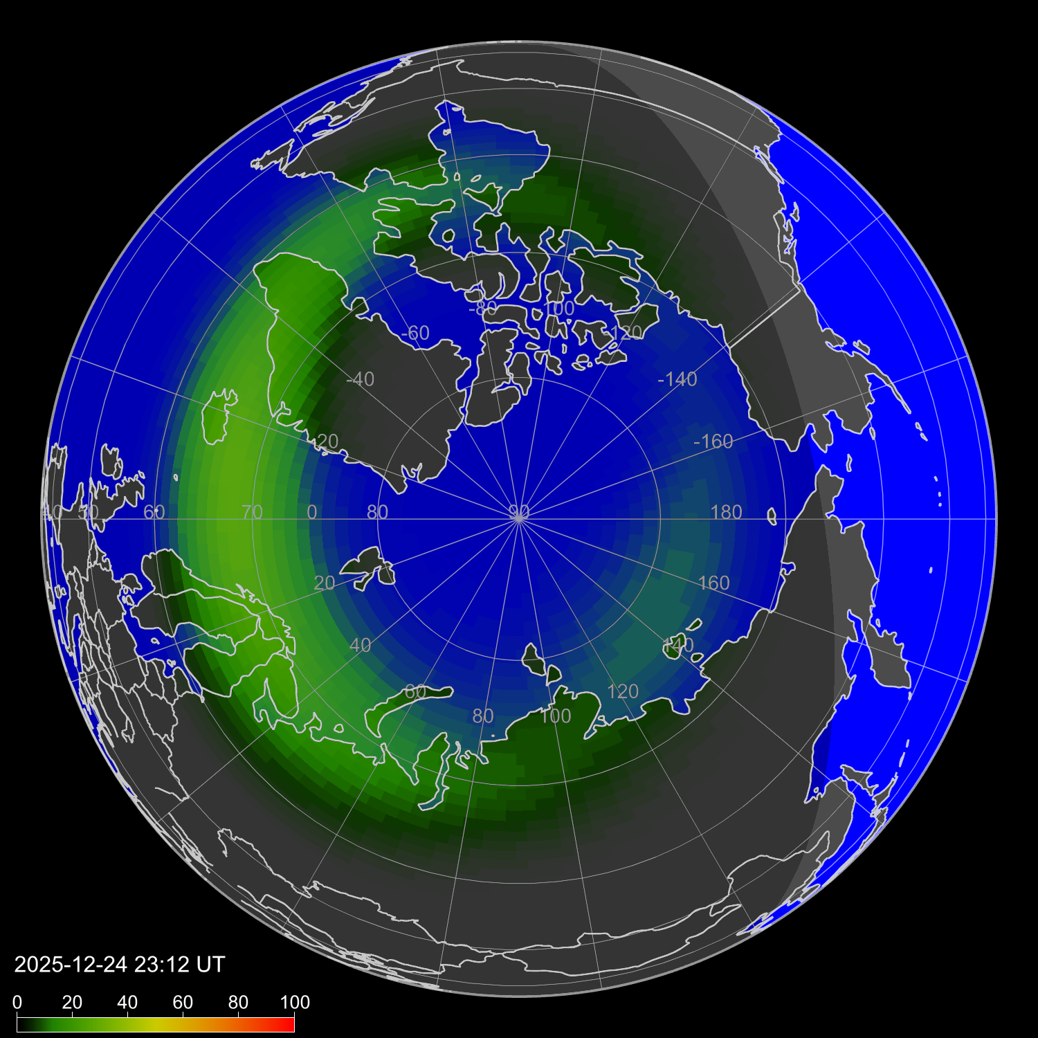 Изменения и часовой прогноз индекса интенсивности полярных сияний с 2025-12-23 по 2025-12-24