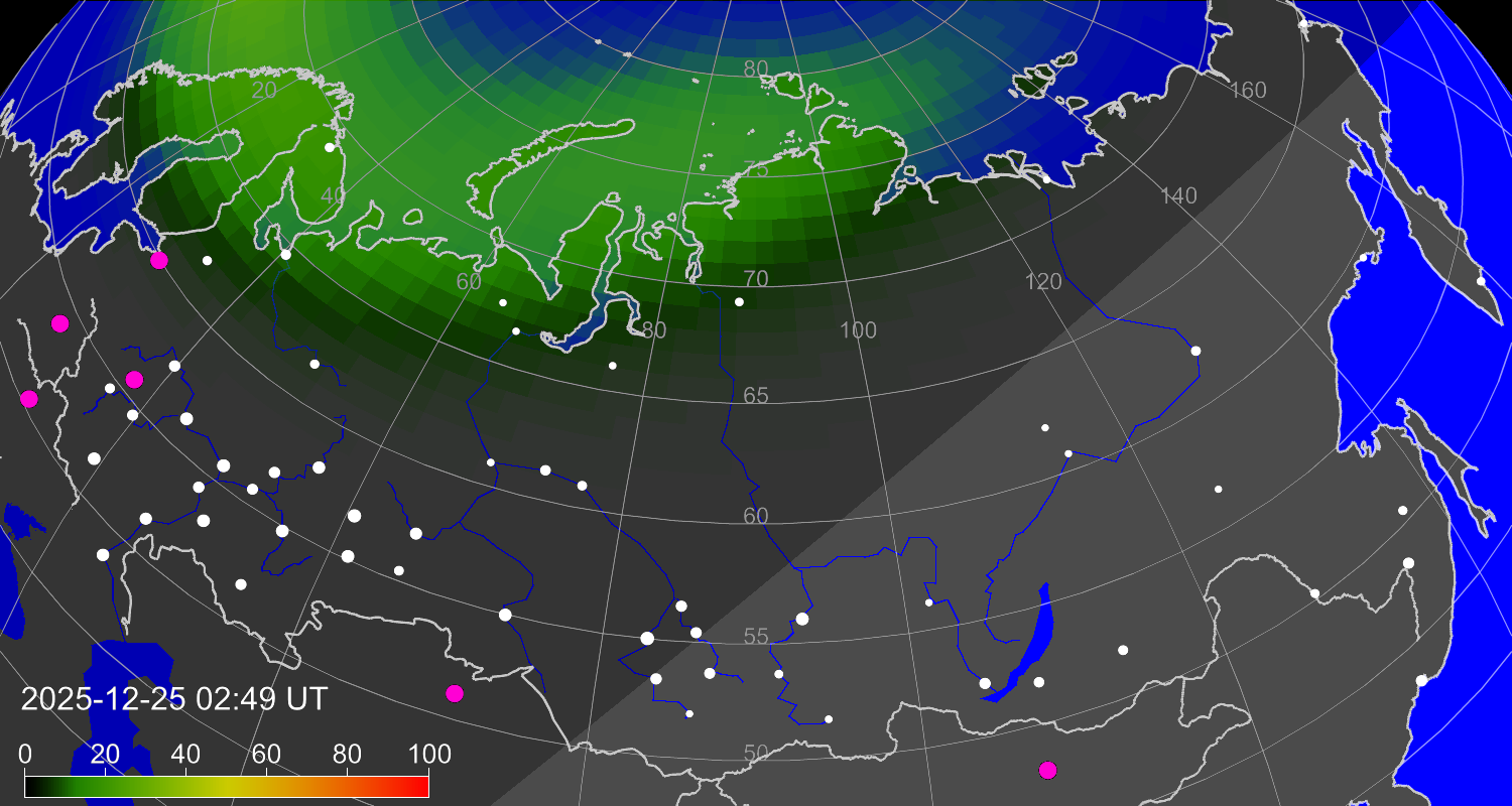 Индекс интенсивности полярных сияний и теоретически возможная широта наблюдений для ночного времени в восточном полушарии