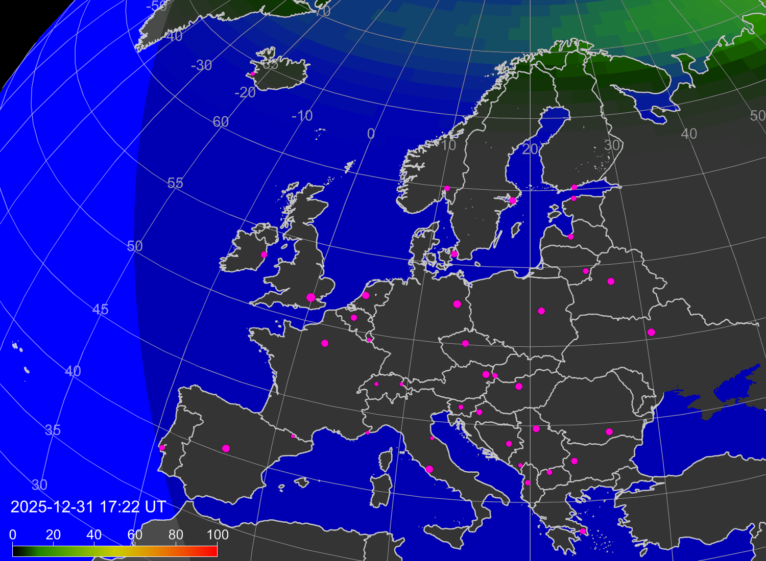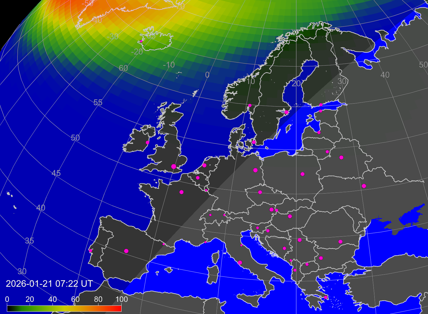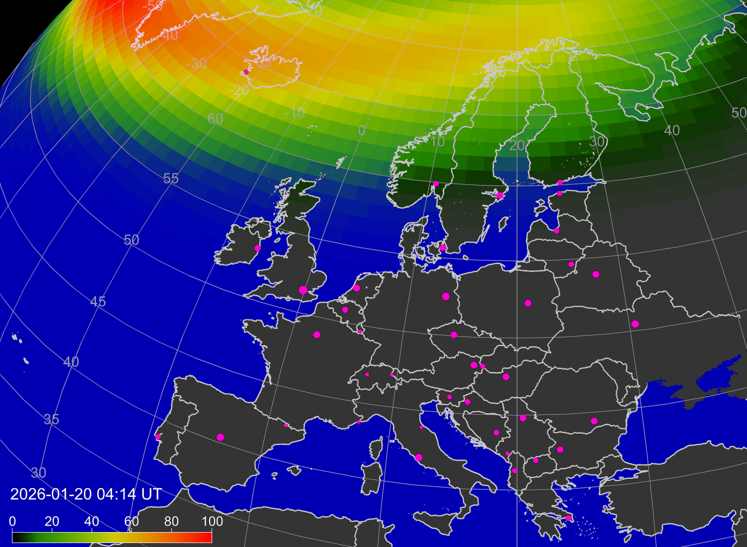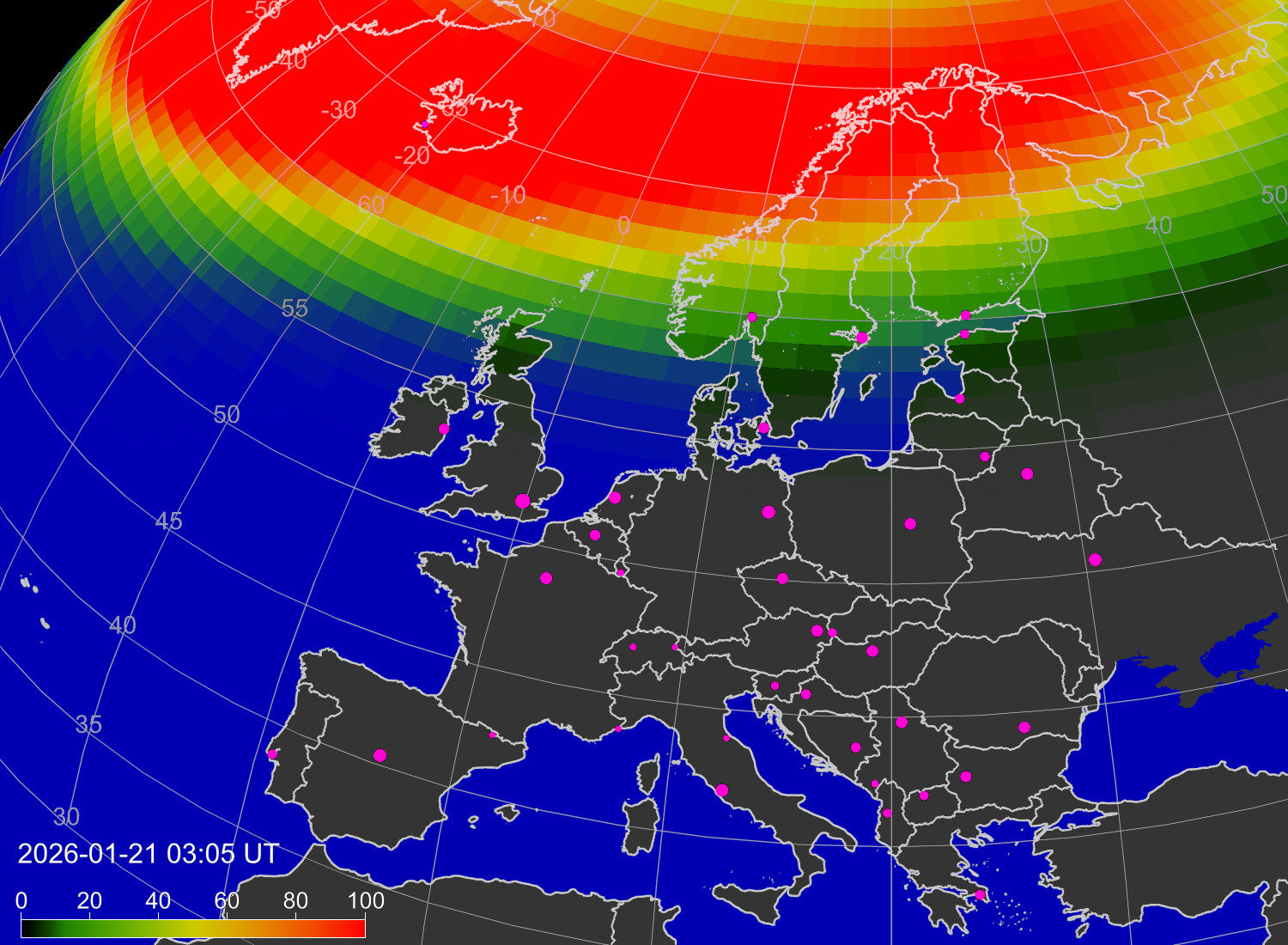 Вероятность полярных сияний в городах Европы