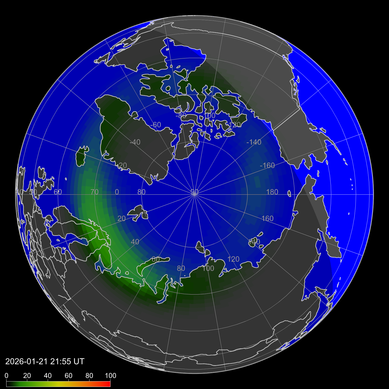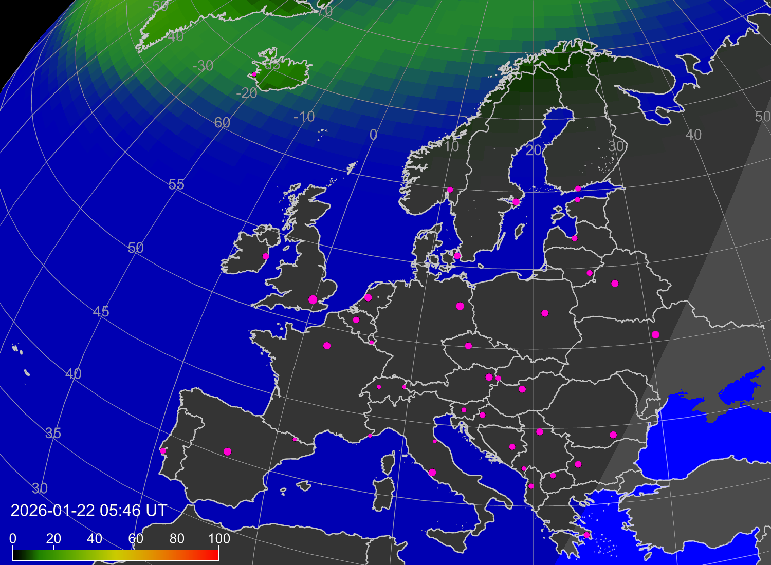 Индекс интенсивности полярных сияний и теоретически возможная широта наблюдений для ночного времени в восточном полушарии
