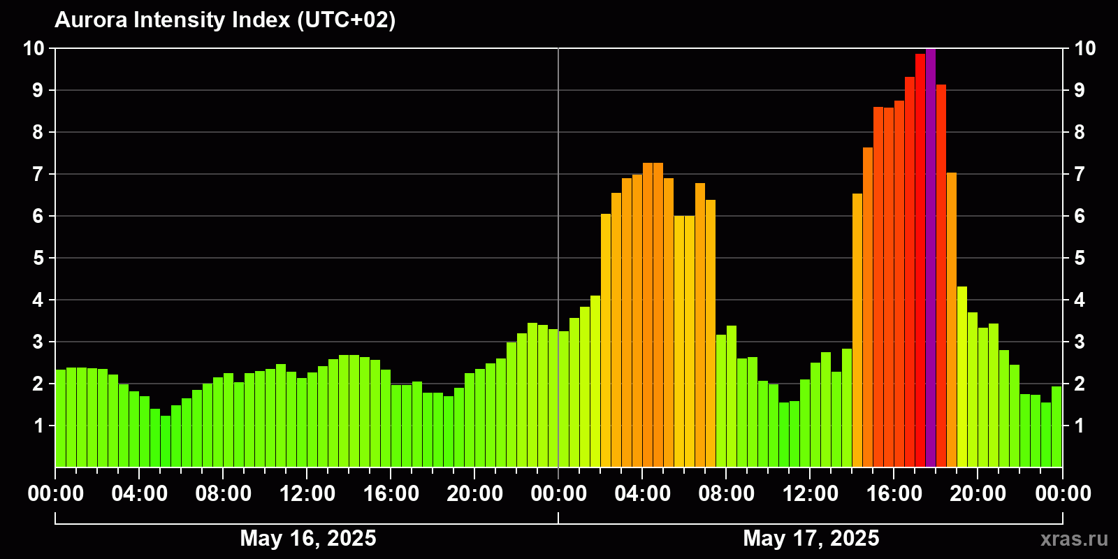Changes in the auroral intensity index from 2025-05-16 to 2025-05-17 local time