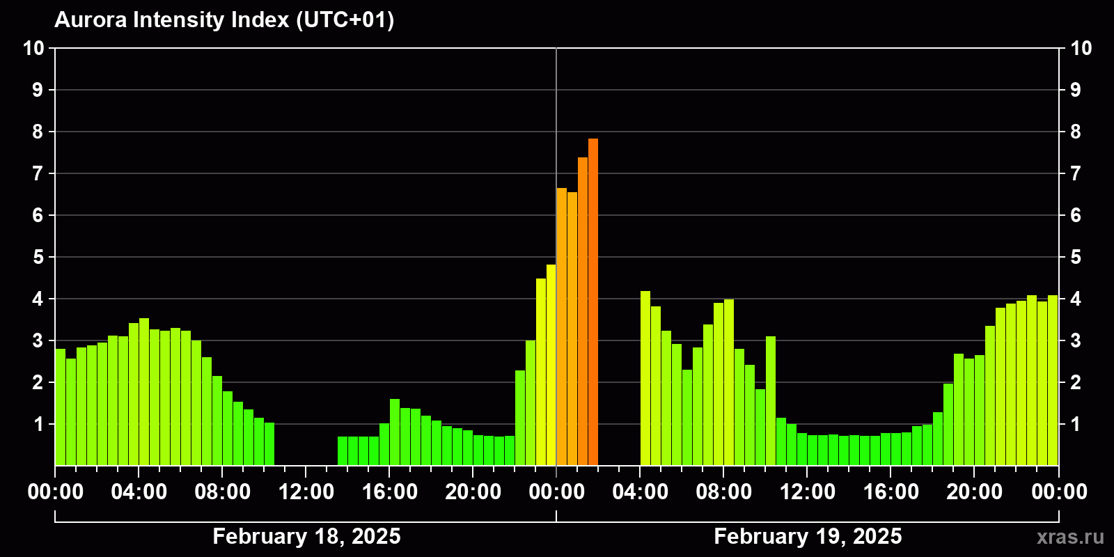 Changes in the auroral intensity index from 2025-02-18 to 2025-02-19 local time