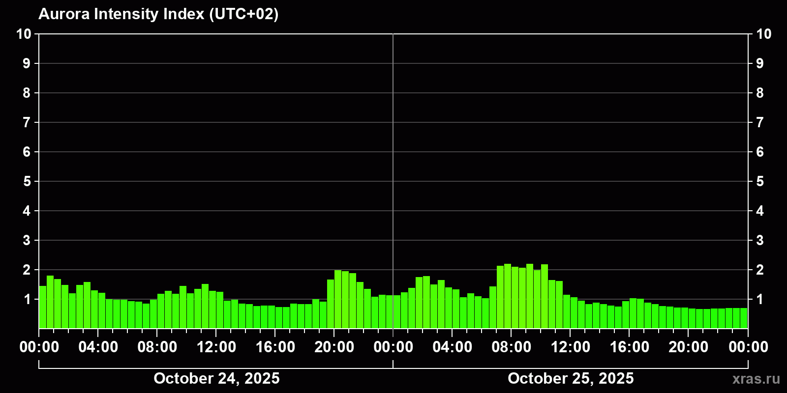 Auroral intensity index and the theoretically possible latitude of observations for nighttime in the Estern Hemisphere as of 2025-10-25 23:50 (end of day) local time