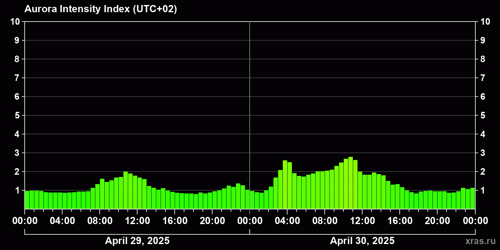 Auroral intensity index and the theoretically possible latitude of observations for nighttime in the Estern Hemisphere as of 2025-04-30 23:59 (end of day) local time
