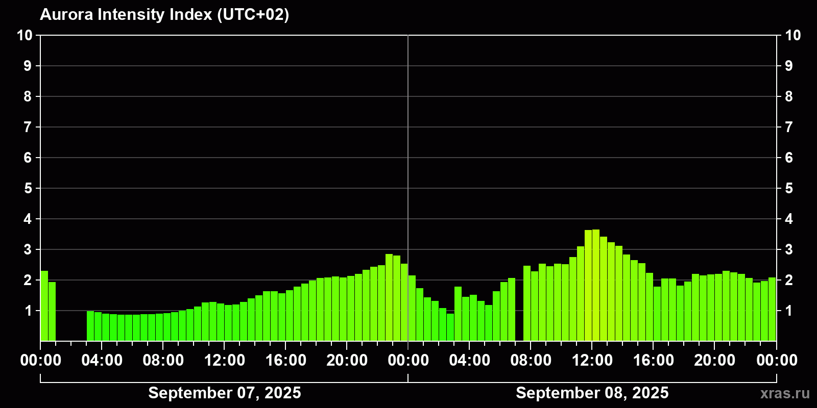 Changes in the auroral intensity index from 2025-09-07 to 2025-09-08 local time