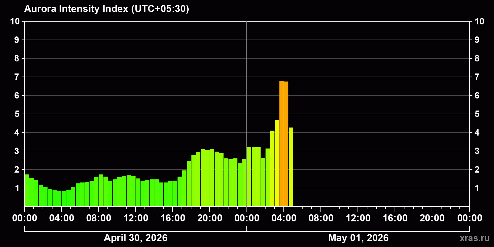 Auroral intensity index and the theoretically possible latitude of observations for nighttime in the Estern Hemisphere as of 2026-05-01 03:52 (end of day) local time