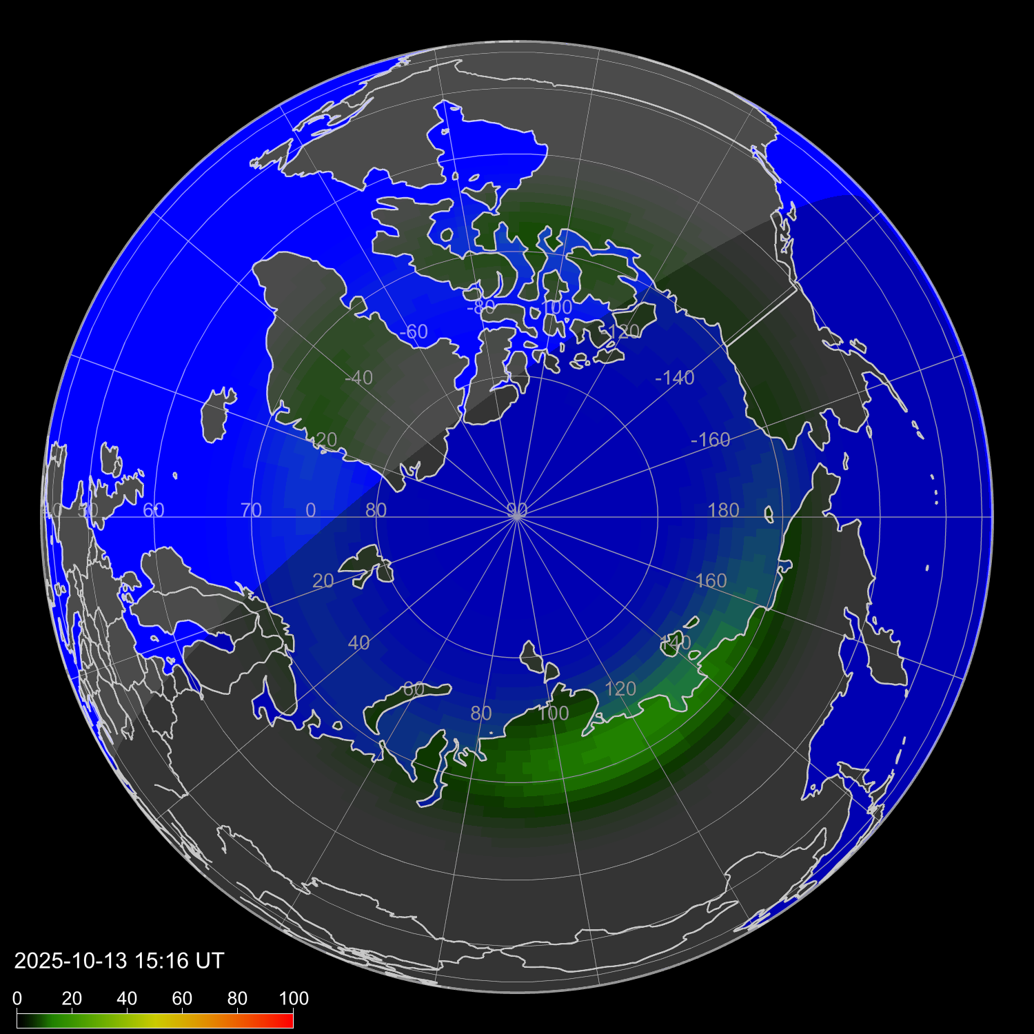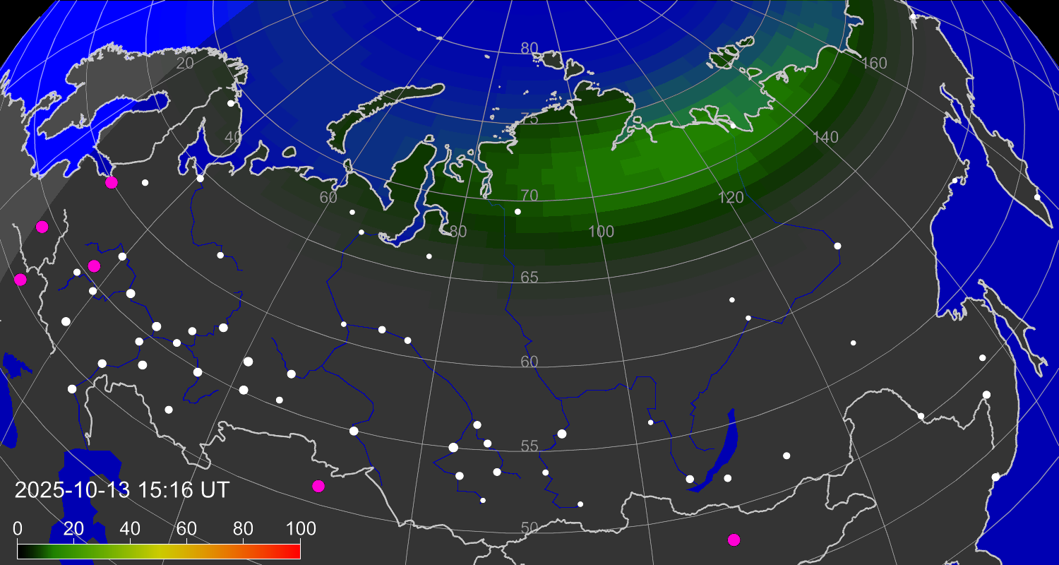 Индекс интенсивности полярных сияний и теоретически возможная широта наблюдений для ночного времени в восточном полушарии