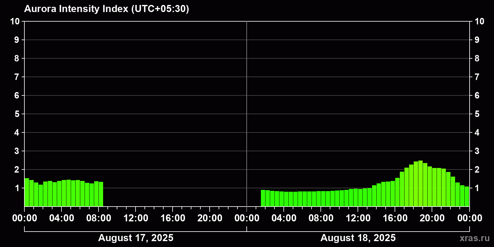 Changes in the auroral intensity index from 2025-08-17 to 2025-08-18 local time