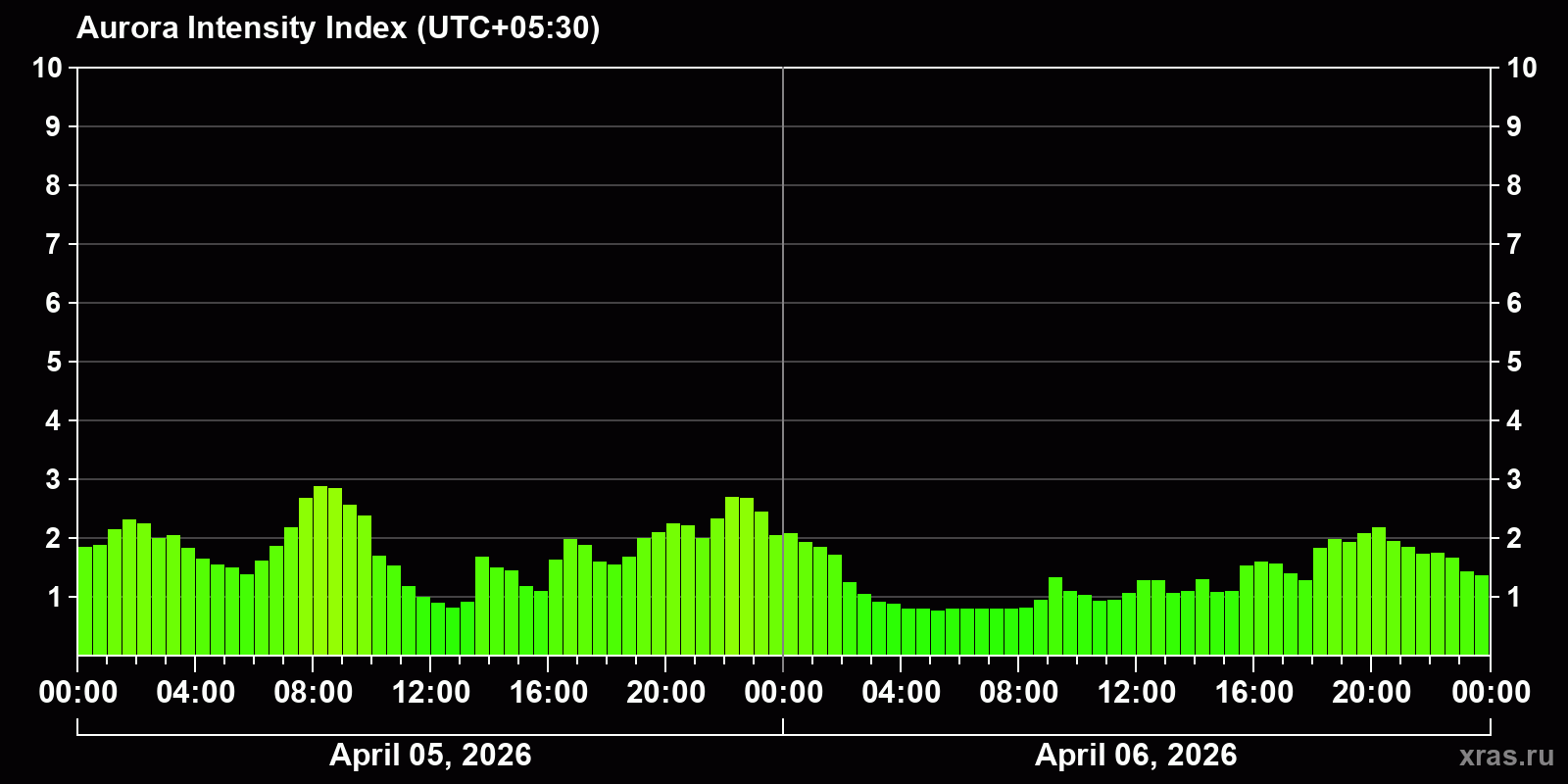 Changes in the auroral intensity index from 2026-04-05 to 2026-04-06 local time