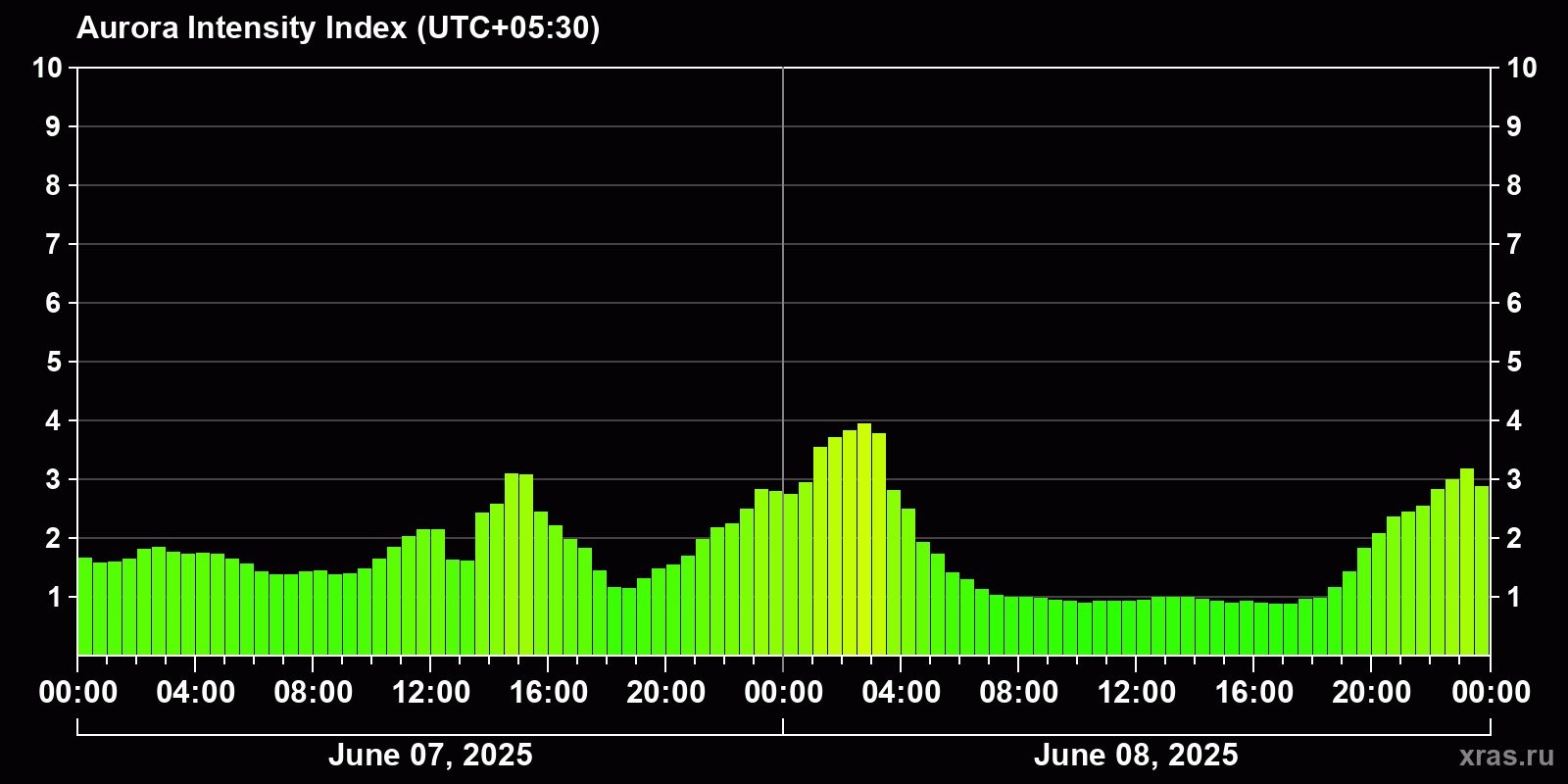 Auroral intensity index and the theoretically possible latitude of observations for nighttime in the Estern Hemisphere as of 2025-06-08 23:48 (end of day) local time