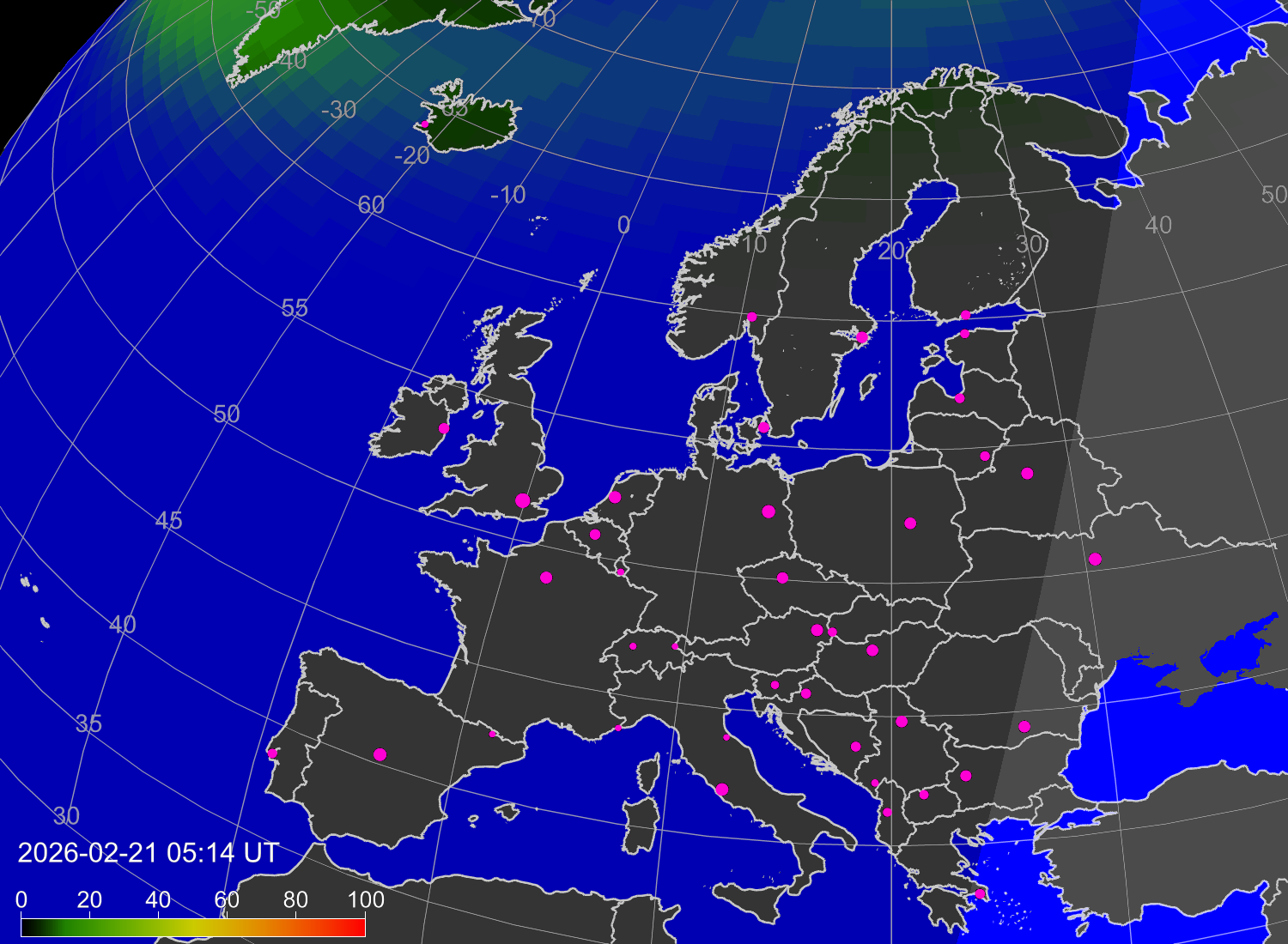 Индекс интенсивности полярных сияний и теоретически возможная широта наблюдений для ночного времени в восточном полушарии