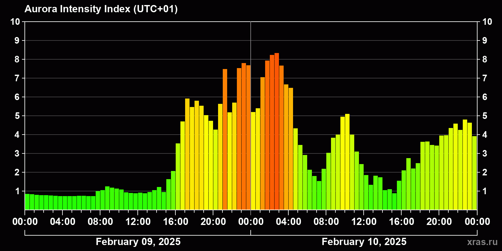 Changes in the auroral intensity index from 2025-02-09 to 2025-02-10 local time