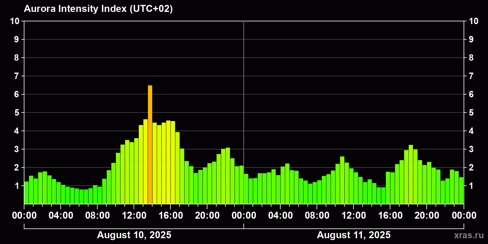 Changes in the auroral intensity index from 2025-08-10 to 2025-08-11 local time