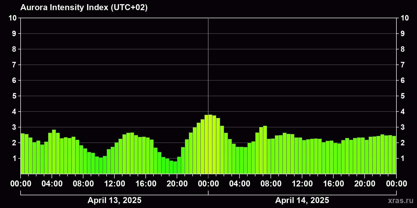 Auroral intensity index and the theoretically possible latitude of observations for nighttime in the Estern Hemisphere as of 2025-04-14 23:51 (end of day) local time