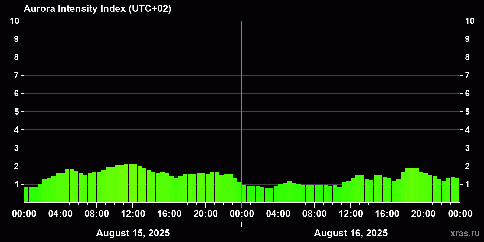 Changes in the auroral intensity index from 2025-08-15 to 2025-08-16 local time