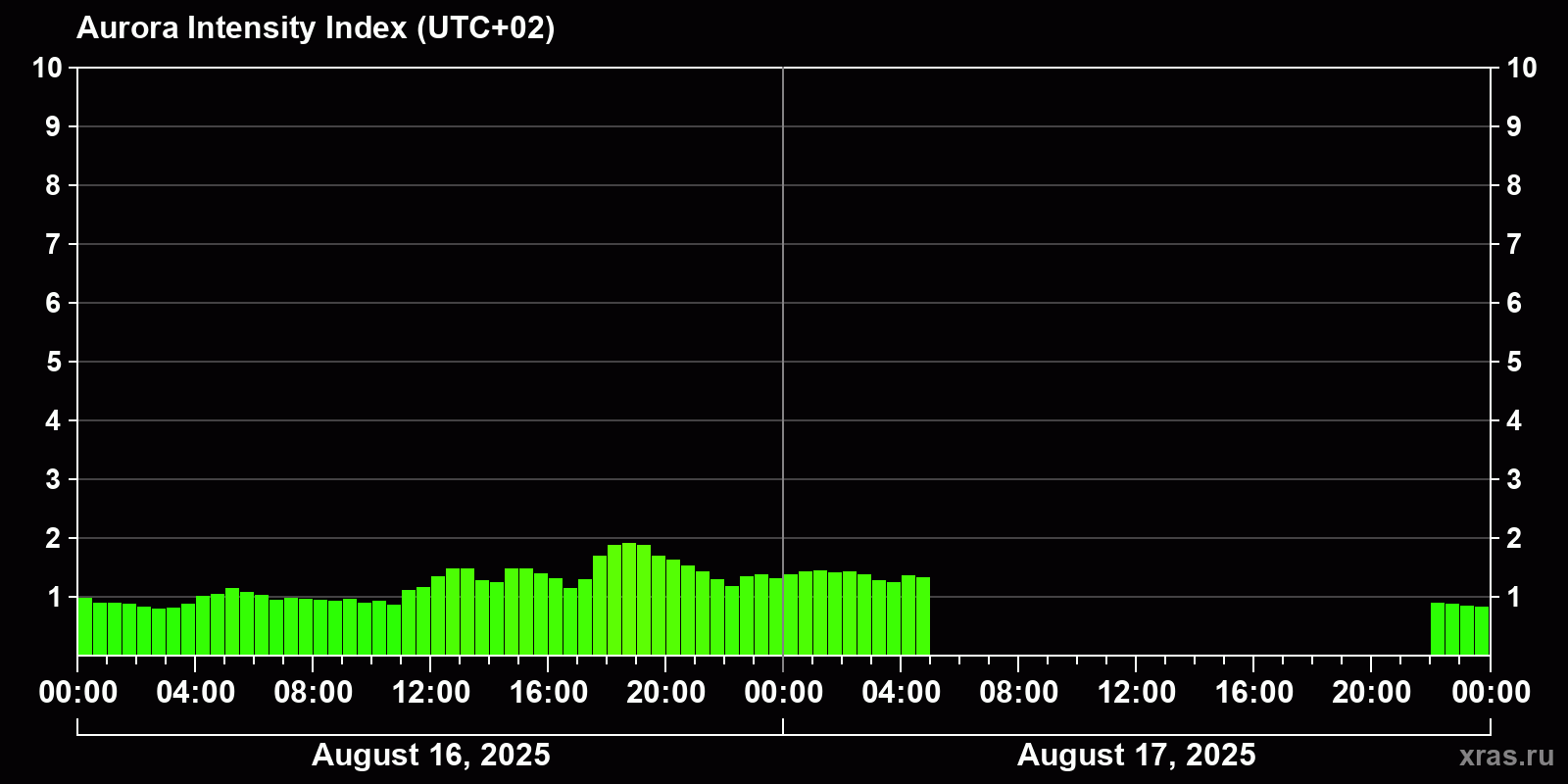 Auroral intensity index and the theoretically possible latitude of observations for nighttime in the Estern Hemisphere as of 2025-08-17 23:54 (end of day) local time