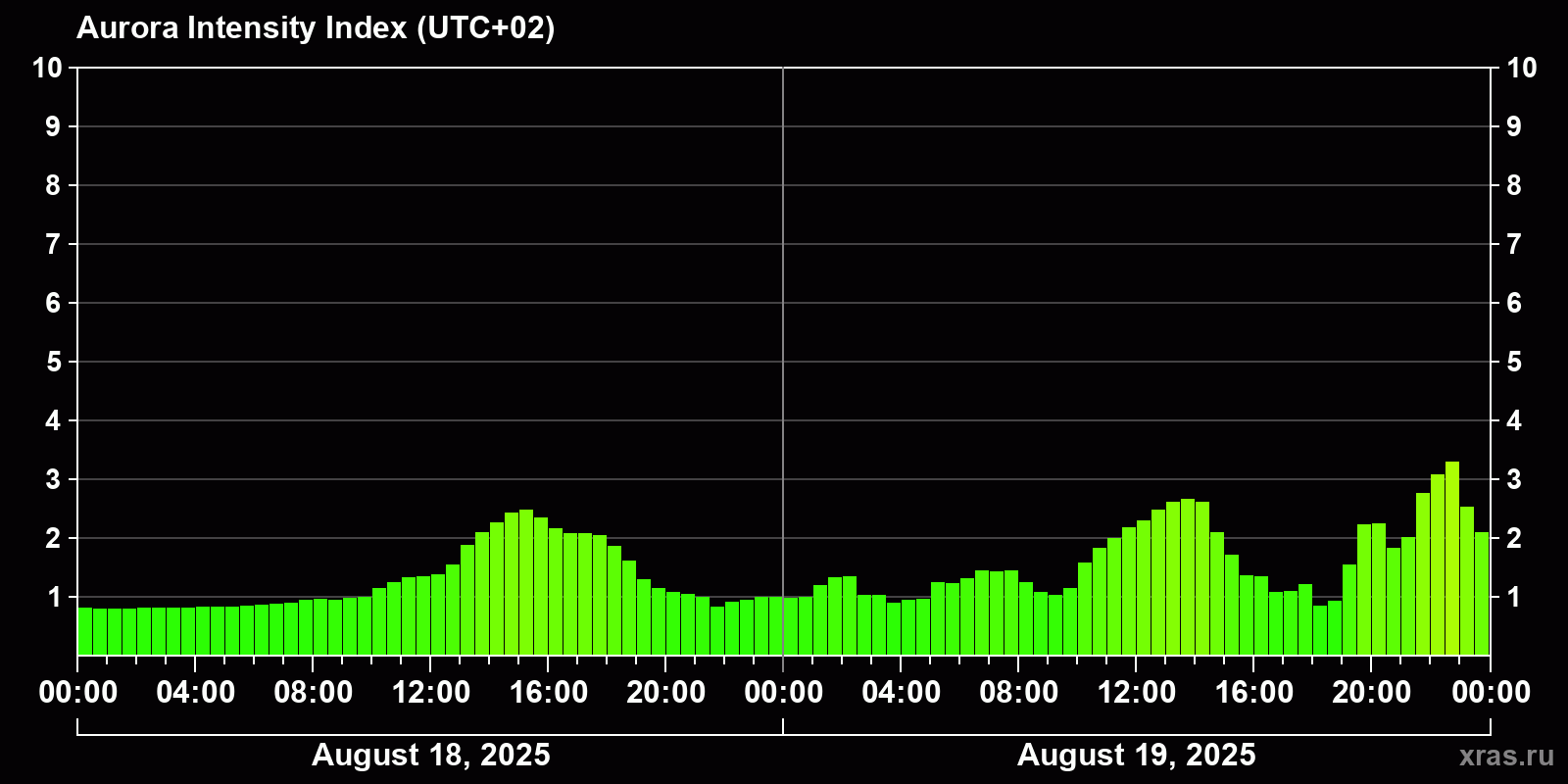 Auroral intensity index and the theoretically possible latitude of observations for nighttime in the Estern Hemisphere as of 2025-08-19 23:46 (end of day) local time