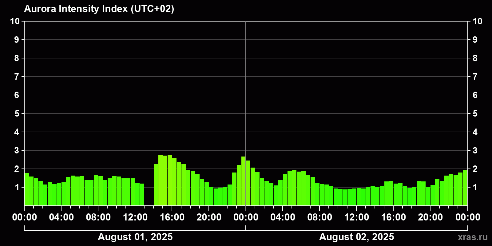 Auroral intensity index and the theoretically possible latitude of observations for nighttime in the Estern Hemisphere as of 2025-08-02 23:51 (end of day) local time