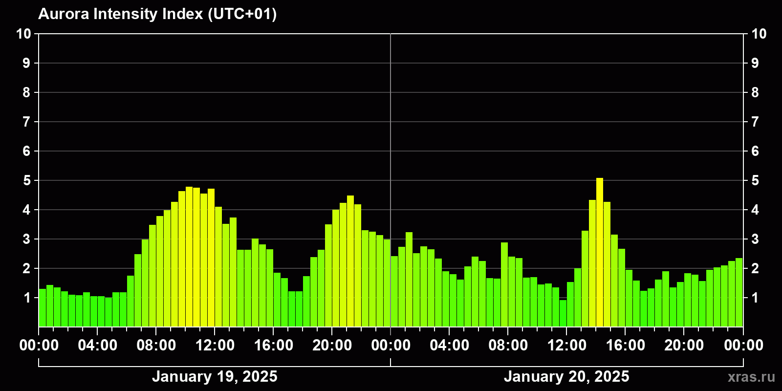 Changes in the auroral intensity index from 2025-01-19 to 2025-01-20 local time