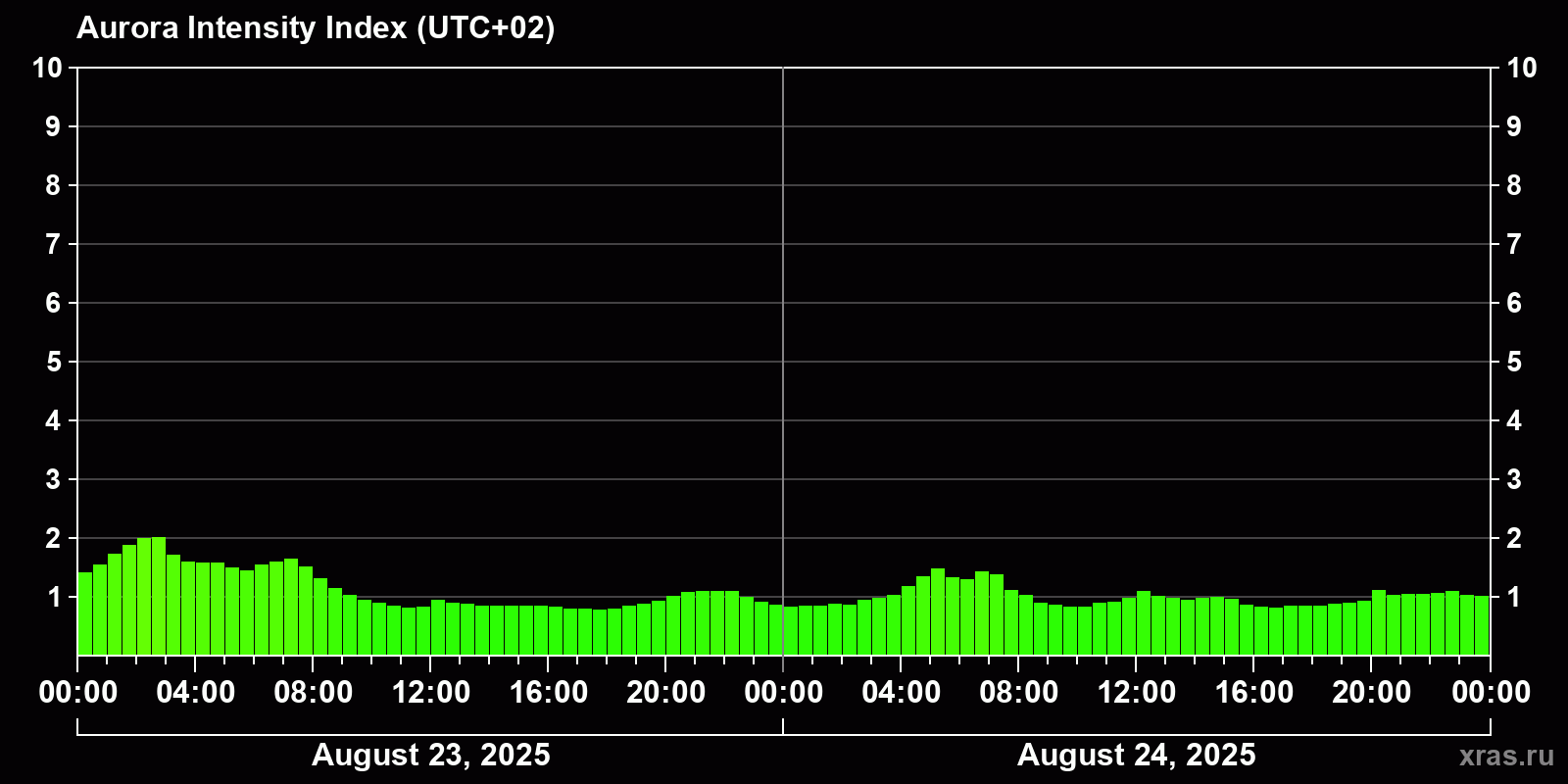 Auroral intensity index and the theoretically possible latitude of observations for nighttime in the Estern Hemisphere as of 2025-08-24 23:46 (end of day) local time