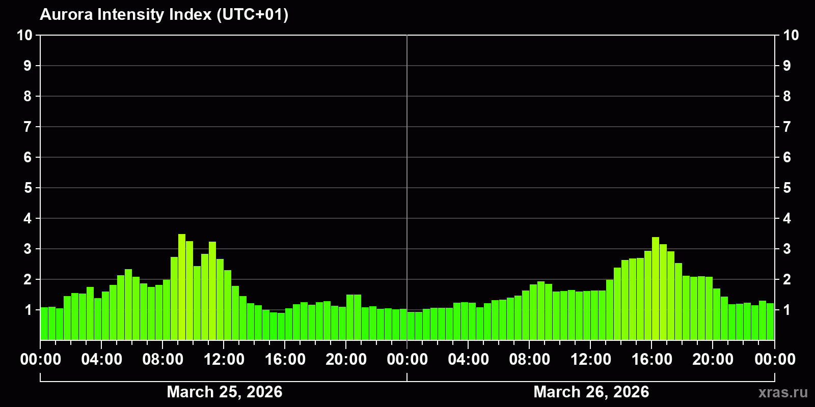 Changes in the auroral intensity index from 2026-03-25 to 2026-03-26 local time