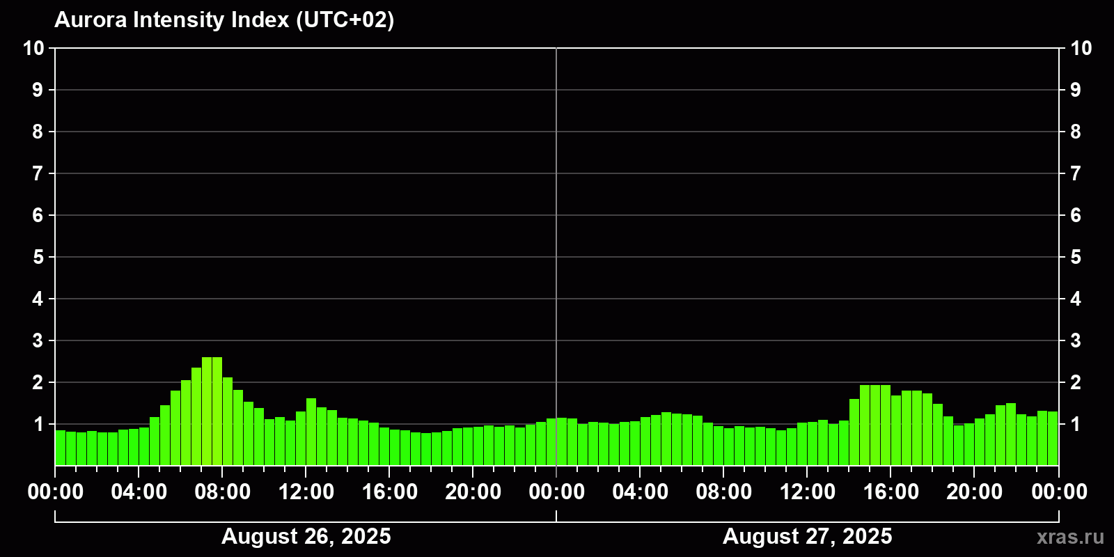 Changes in the auroral intensity index from 2025-08-26 to 2025-08-27 local time