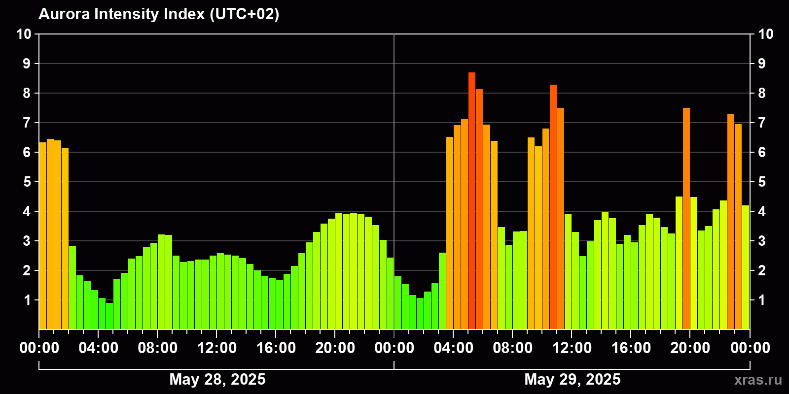 Auroral intensity index and the theoretically possible latitude of observations for nighttime in the Estern Hemisphere as of 2025-05-29 23:59 (end of day) local time