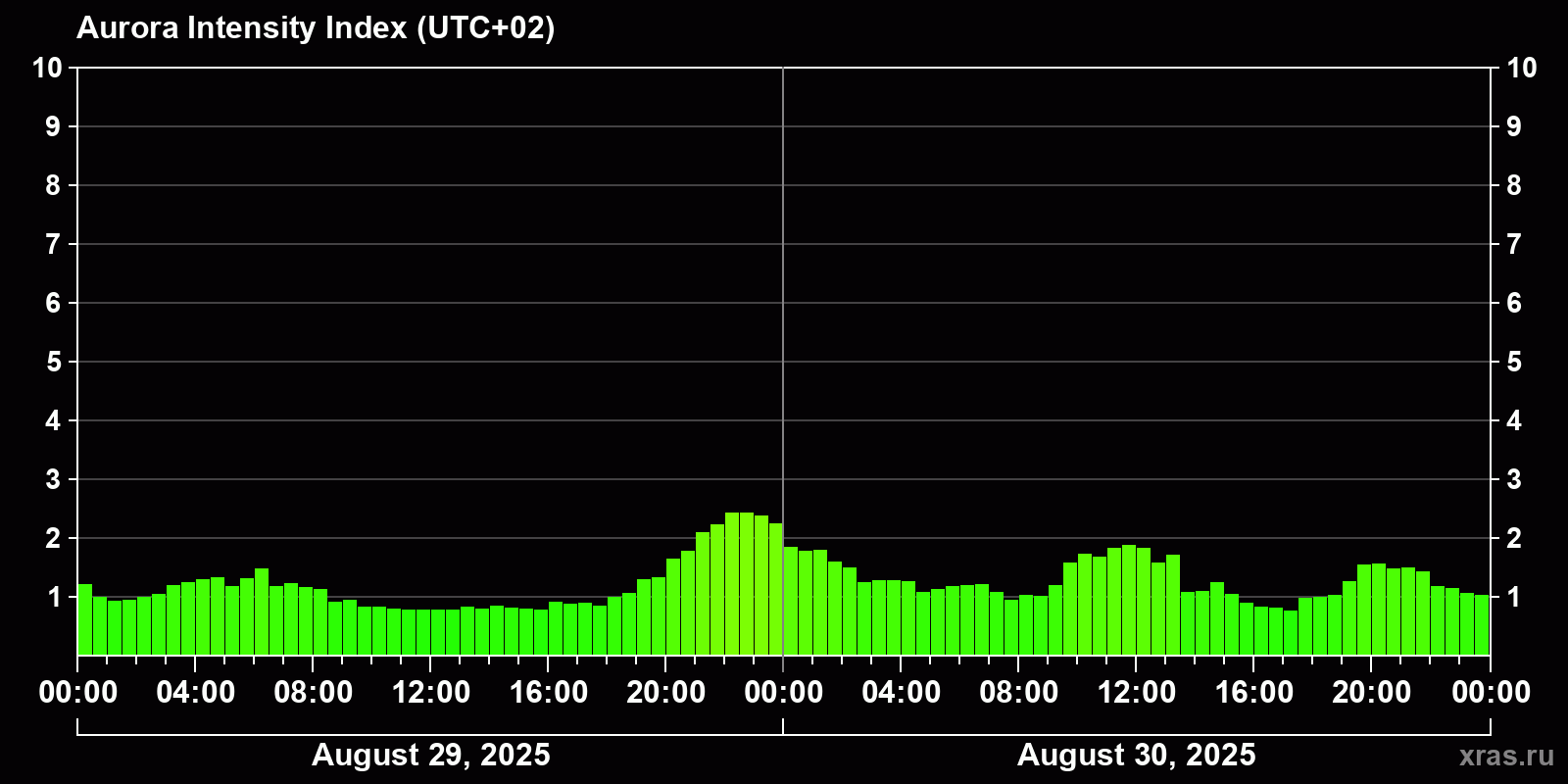 Changes in the auroral intensity index from 2025-08-29 to 2025-08-30 local time