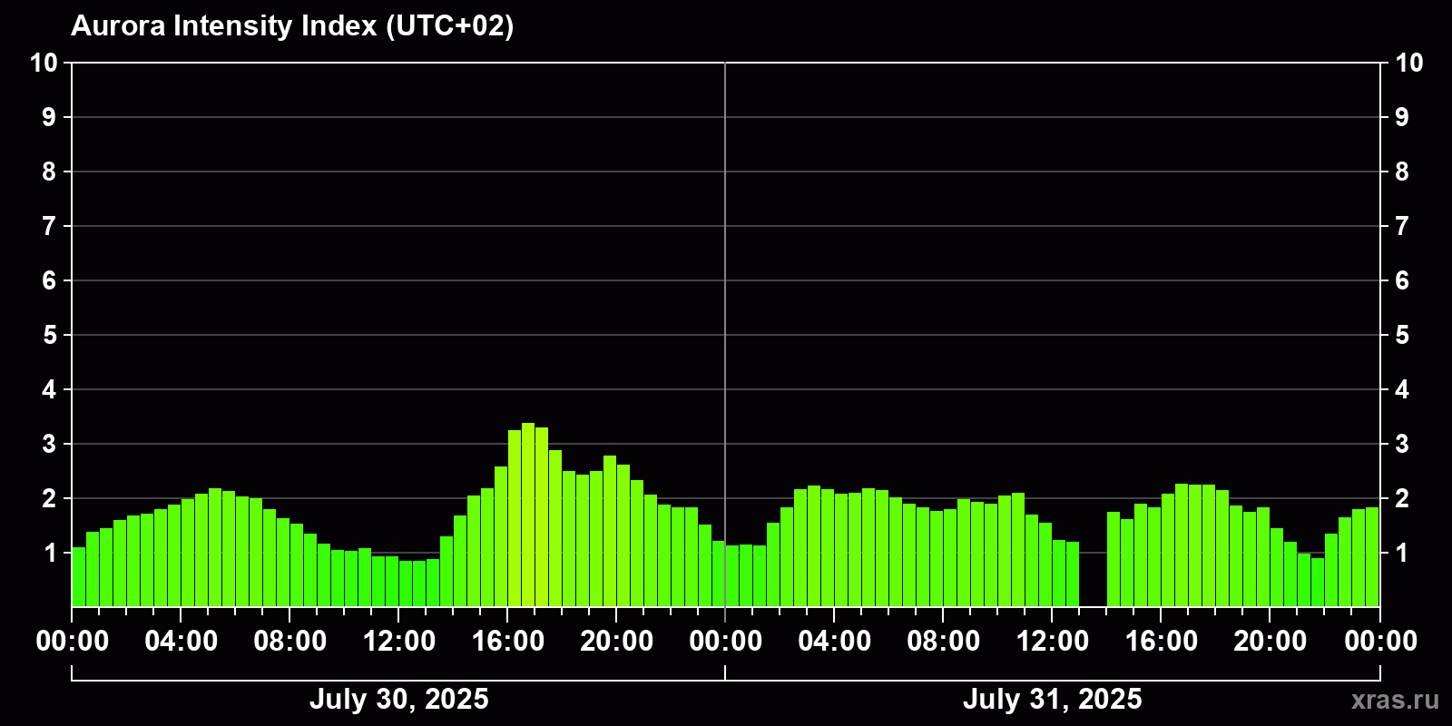 Auroral intensity index and the theoretically possible latitude of observations for nighttime in the Estern Hemisphere as of 2025-07-31 23:56 (end of day) local time