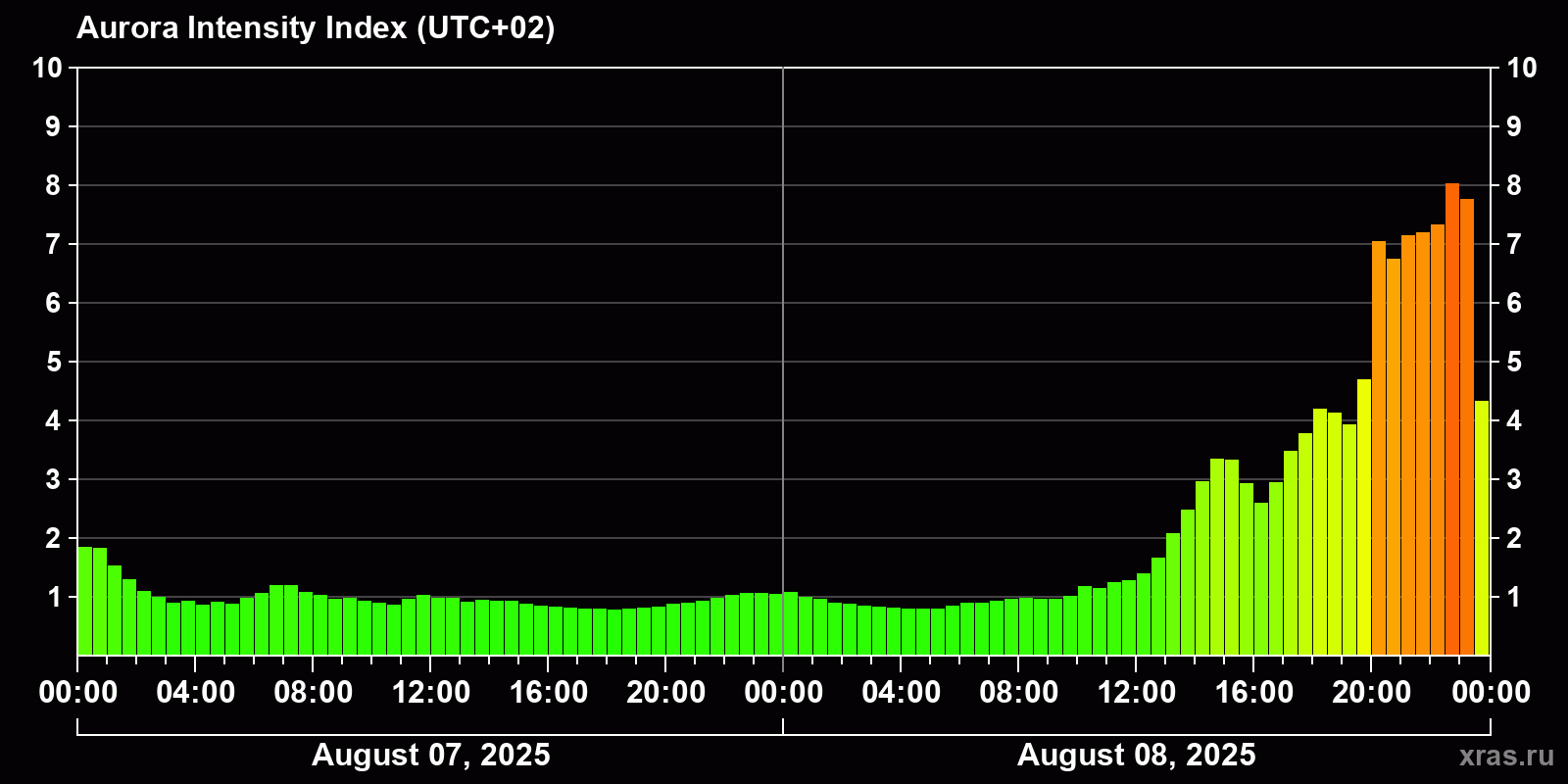 Auroral intensity index and the theoretically possible latitude of observations for nighttime in the Estern Hemisphere as of 2025-08-08 23:47 (end of day) local time