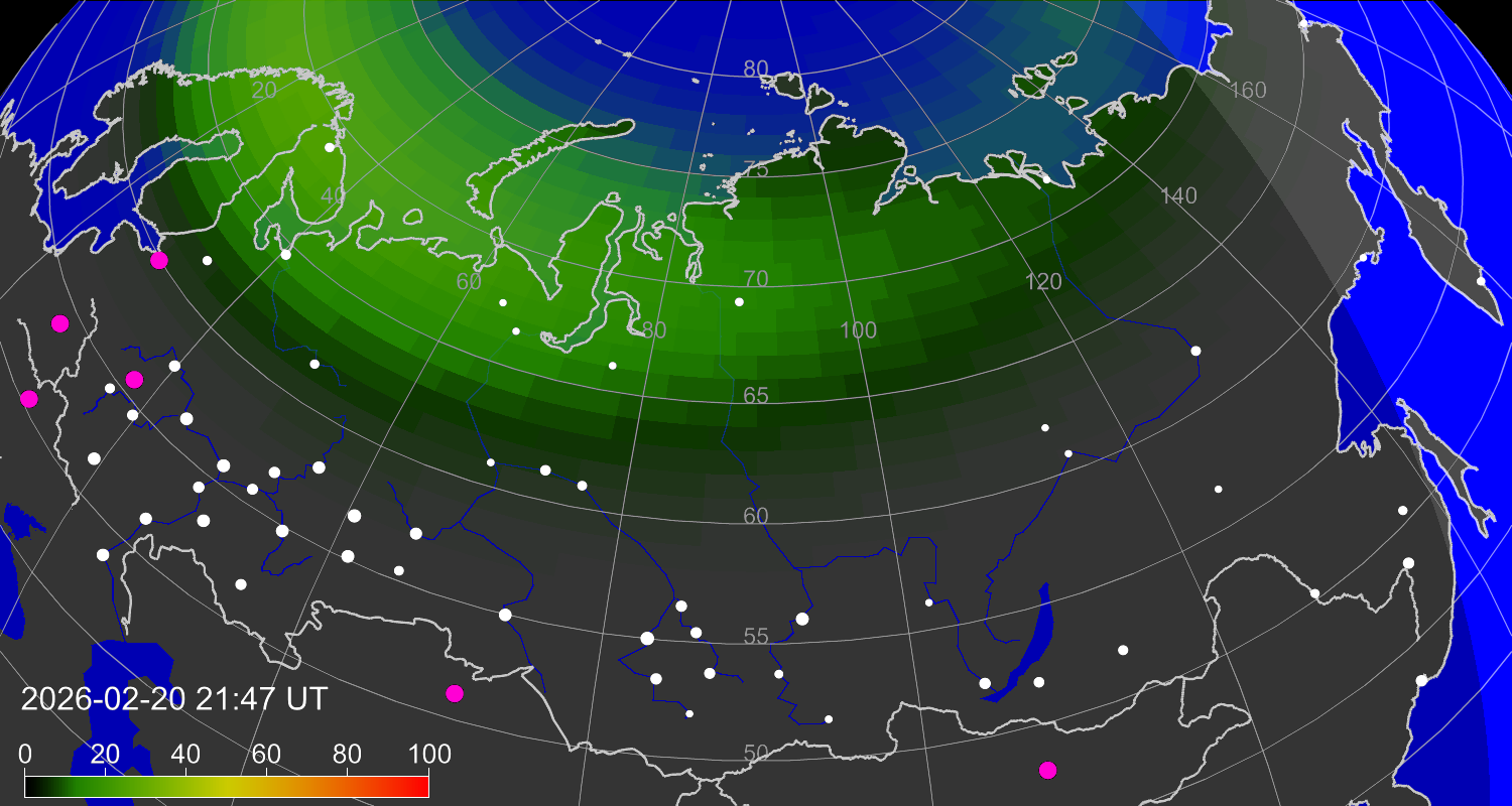 Изменения и часовой прогноз индекса интенсивности полярных сияний с 2026-02-19 по 2026-02-20