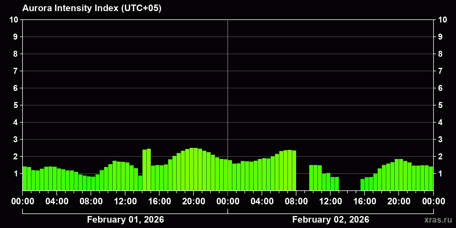 Auroral intensity index and the theoretically possible latitude of observations for nighttime in the Estern Hemisphere as of 2026-02-02 23:47 (end of day) local time