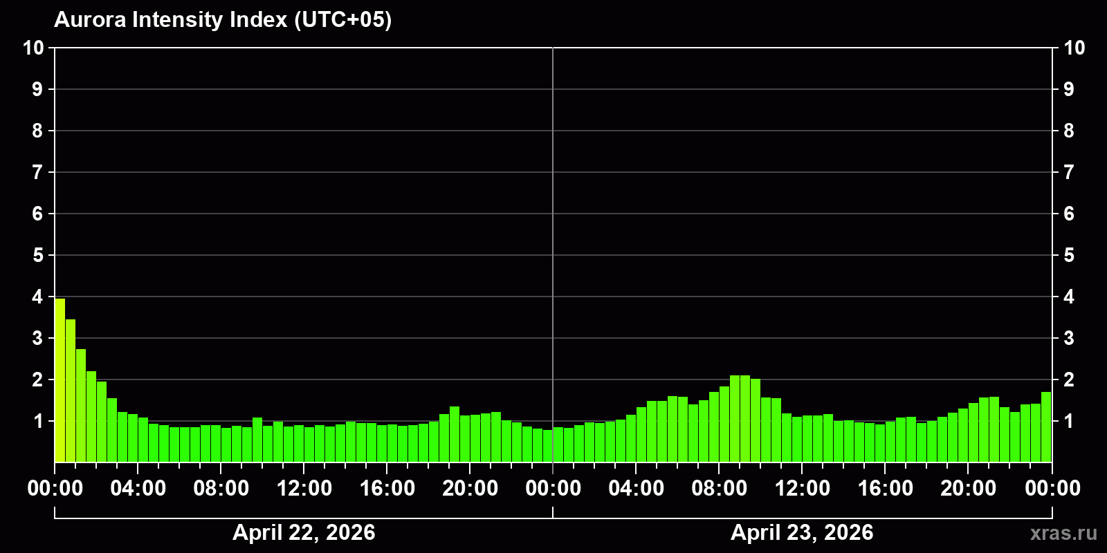Auroral intensity index and the theoretically possible latitude of observations for nighttime in the Estern Hemisphere as of 2026-04-23 23:57 (end of day) local time