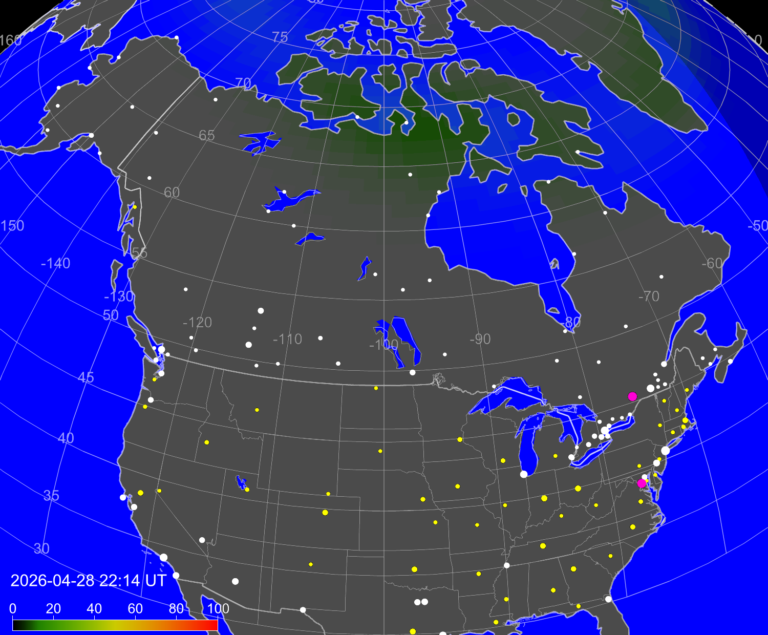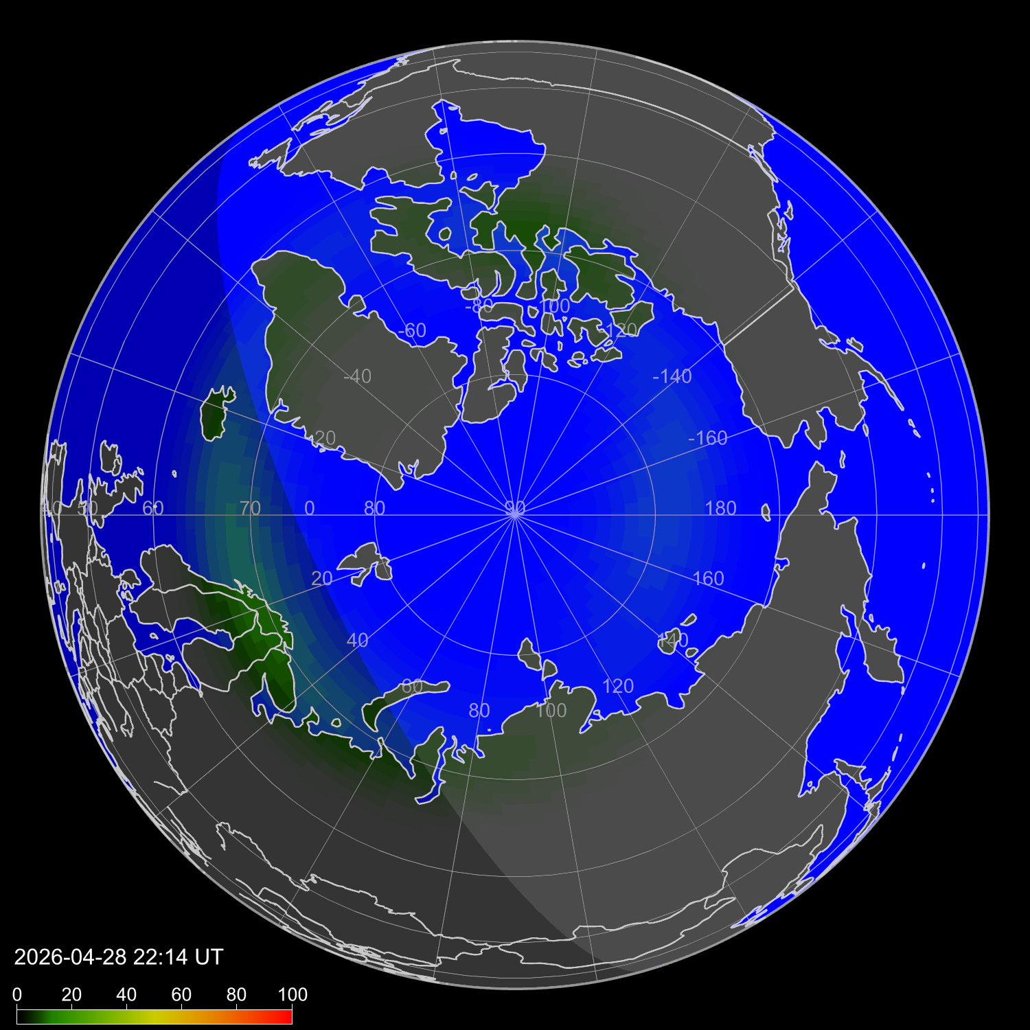 Auroral intensity index and theoretically possible latitude of observations for nighttime in the Western Hemisphere