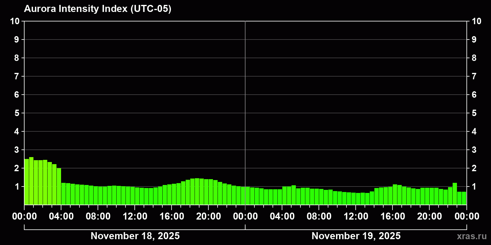 Auroral intensity index and the theoretically possible latitude of observations for nighttime in the Western Hemisphere as of 2025-11-19 23:56 (end of day) local time