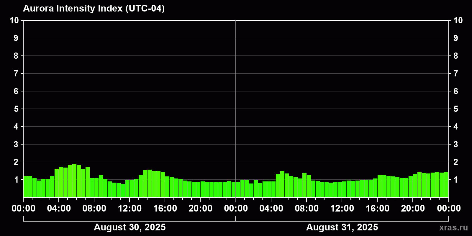 Changes in the auroral intensity index from 2025-08-30 to 2025-08-31 local time