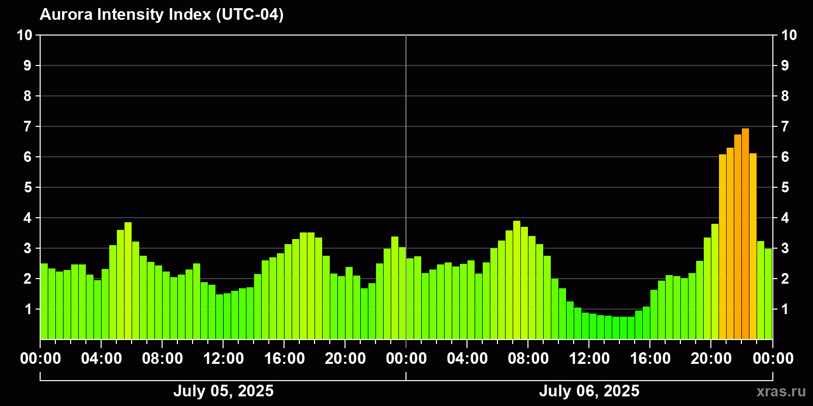 Auroral intensity index and the theoretically possible latitude of observations for nighttime in the Western Hemisphere as of 2025-07-06 23:59 (end of day) local time