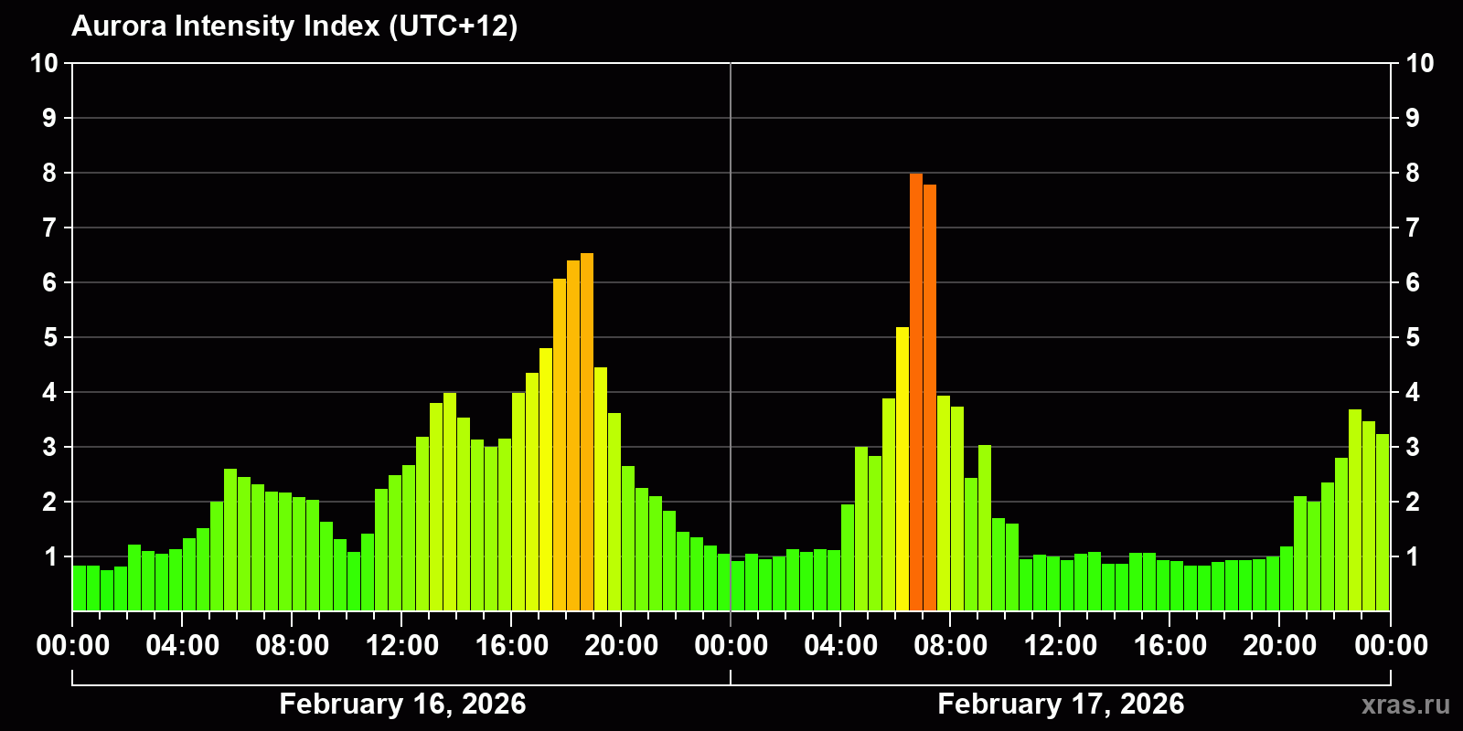 Auroras (northern lights) in Petropavlovsk-Kamchatsky — Feb 17, 2026