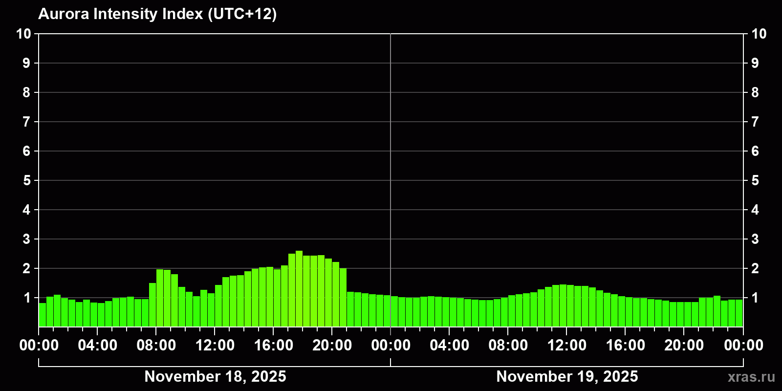 Changes in the auroral intensity index from 2025-11-18 to 2025-11-19 local time
