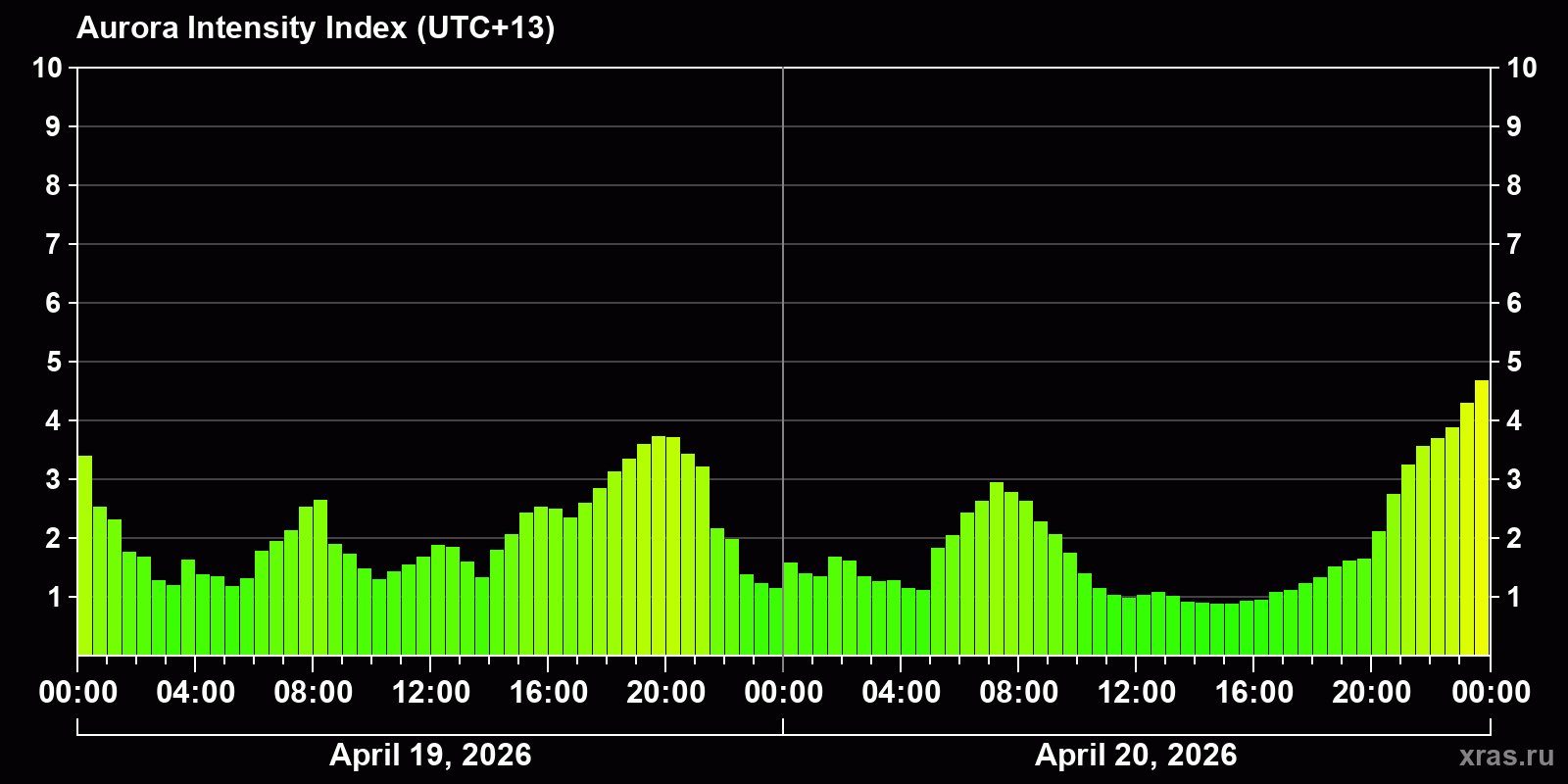 Auroral intensity index and the theoretically possible latitude of observations for nighttime in the Estern Hemisphere as of 2026-04-20 22:47 (end of day) local time