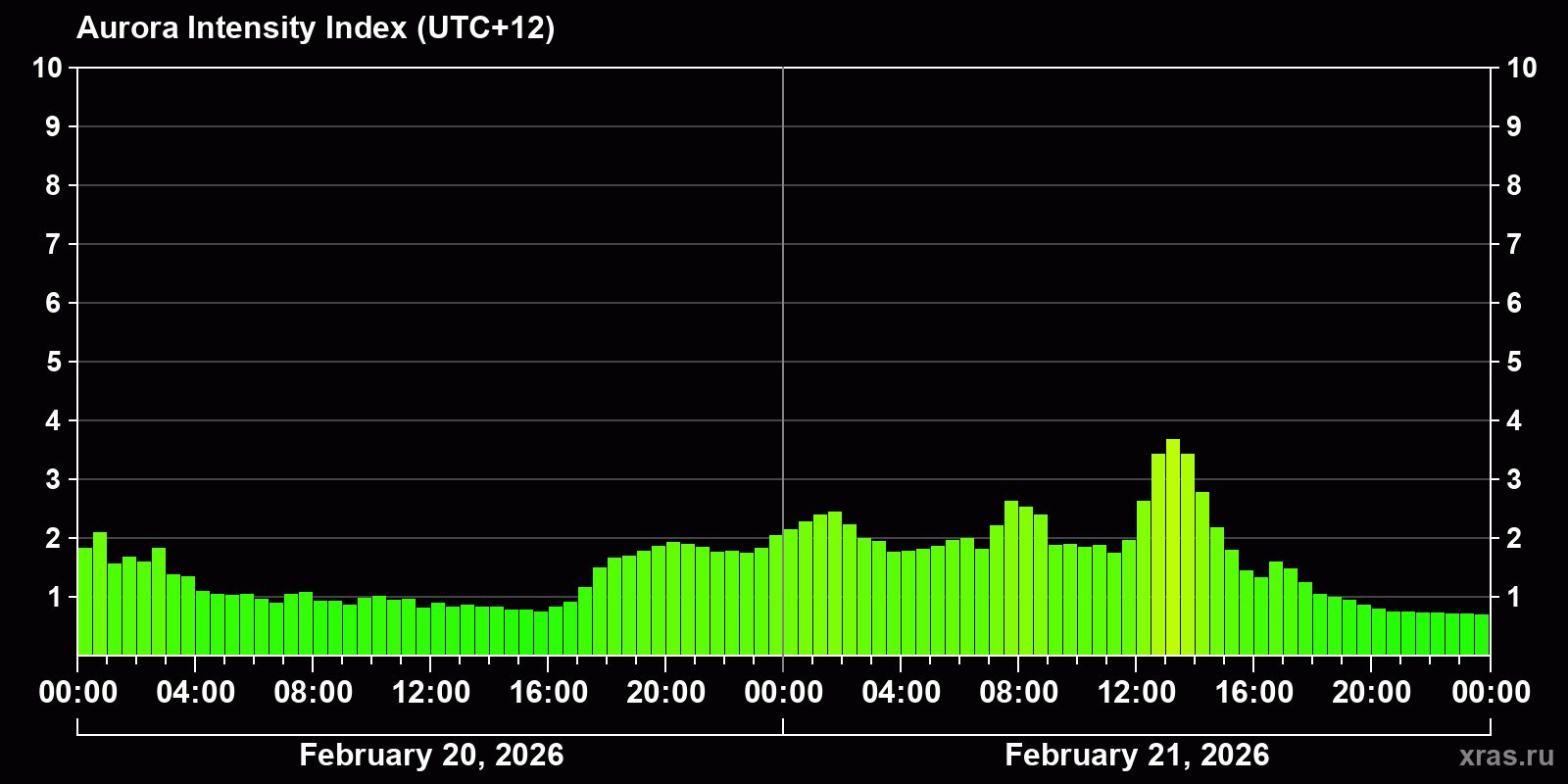 Changes in the auroral intensity index from 2026-02-20 to 2026-02-21 local time