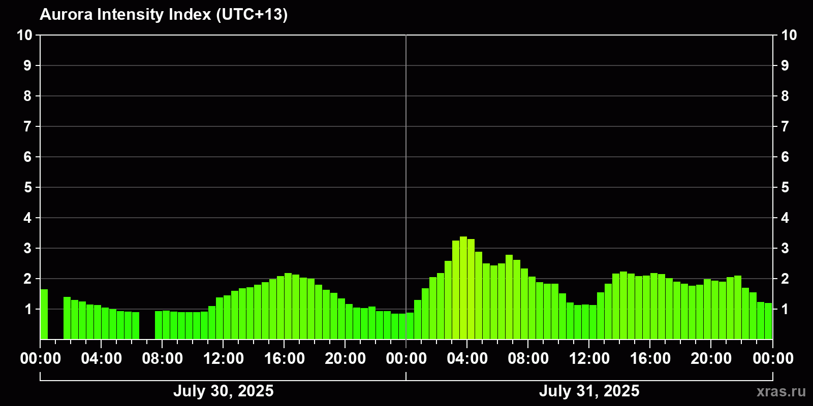 Changes in the auroral intensity index from 2025-07-30 to 2025-07-31 local time