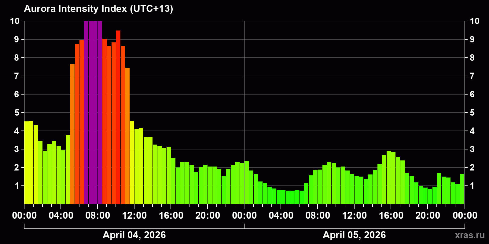 Changes in the auroral intensity index from 2026-04-04 to 2026-04-05 local time