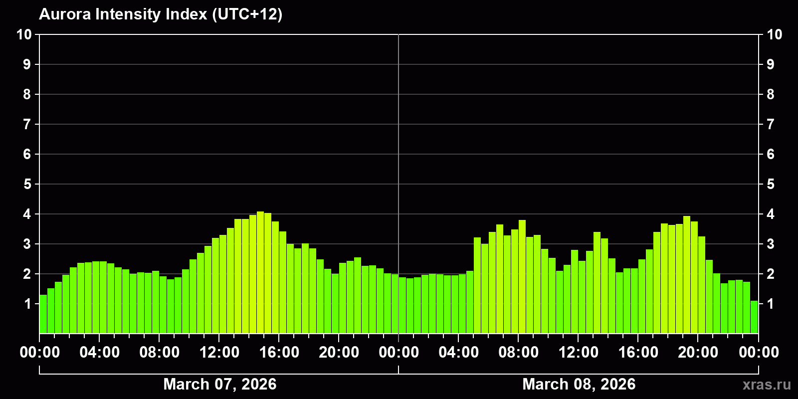 Auroras (northern lights) in Petropavlovsk-Kamchatsky — Mar 08, 2026
