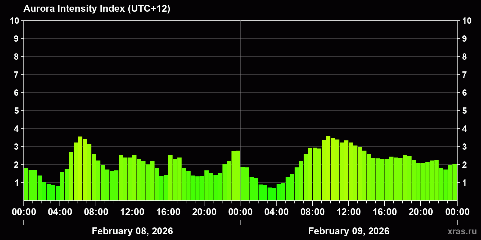 Auroras (northern lights) in Petropavlovsk-Kamchatsky — Feb 09, 2026