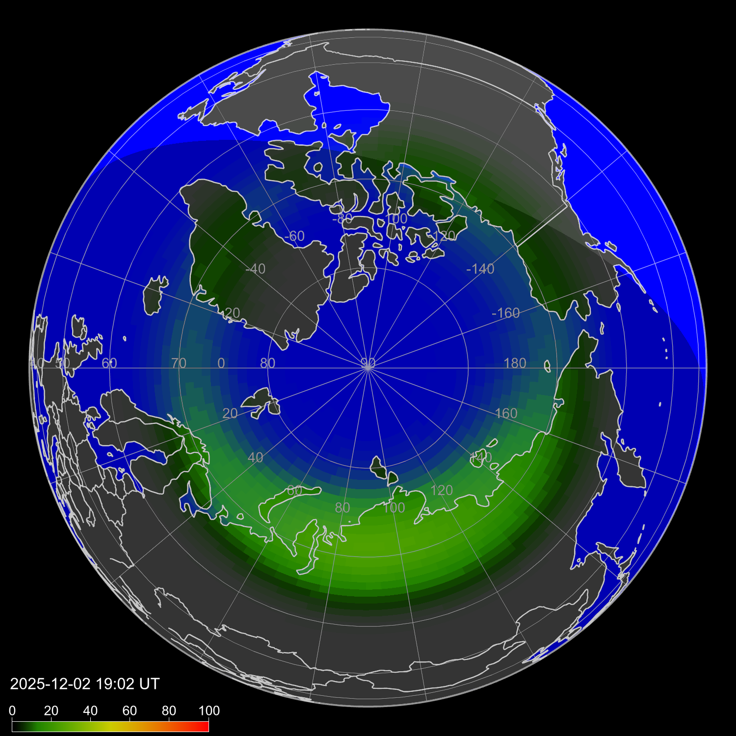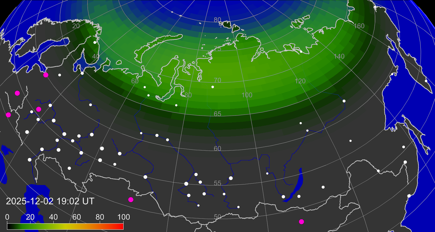 Изменения и часовой прогноз индекса интенсивности полярных сияний с 2025-11-30 по 2025-12-01