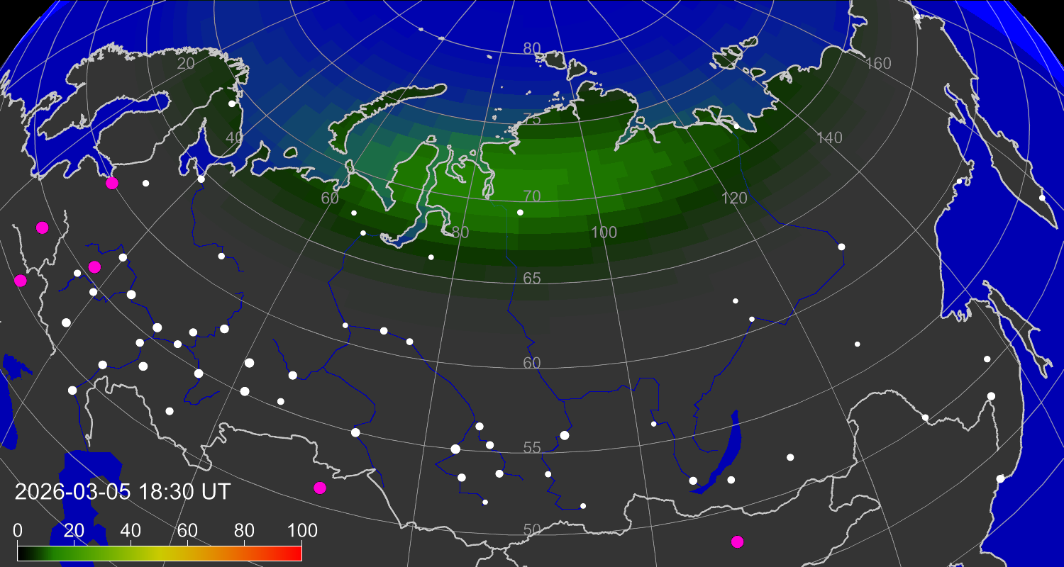 Probability of northern lights (auroras) in cities of Russia