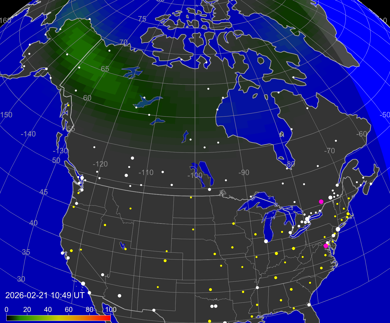 Вероятность полярных сияний в городах США