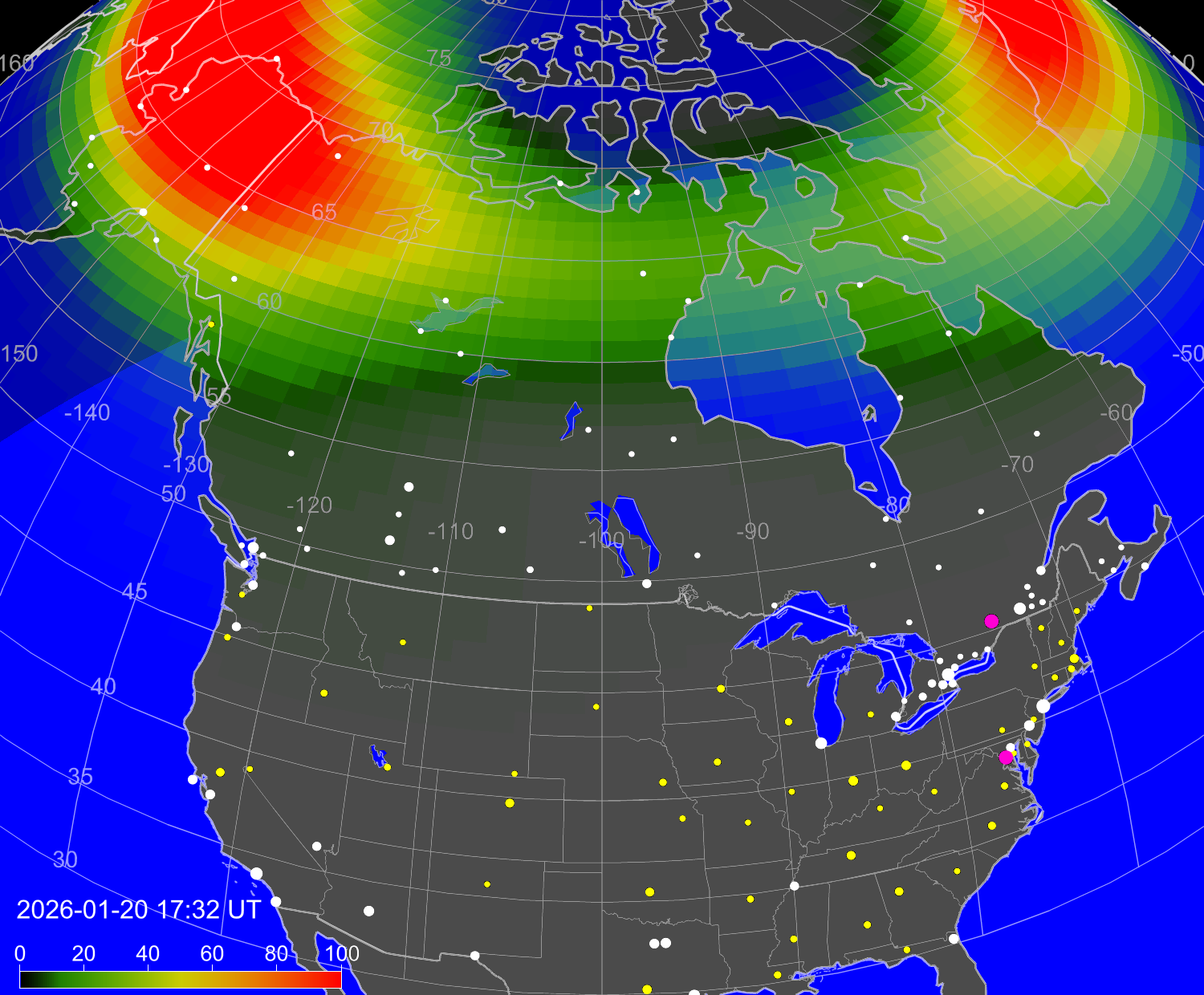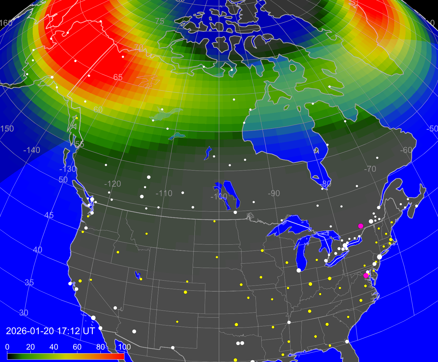Изменения и часовой прогноз индекса интенсивности полярных сияний с 2026-01-19 по 2026-01-20